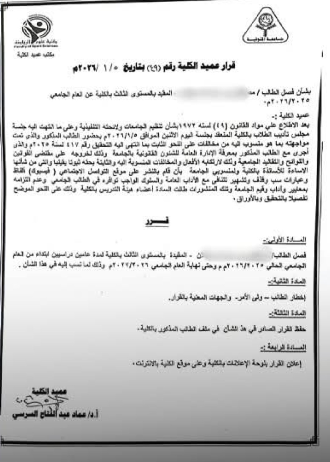 وبحسب المصدر، قامت إدارة الجامعة باتخاذ إجراءات فورية عقب التأكد من صحة الواقعة، حيث تم تحويل الطالب إلى الشئون القانونية للتحقيق معه رسميًا، وبعد انتهاء التحقيقات والاستماع إلى كافة الأطراف المعنية، تقرر توقيع عقوبة الفصل لمدة عامين دراسيين، وذلك لما بدر منه من إساءة علنية عبر وسائل التواصل الاجتماعي، بما يخالف اللوائح الجامعية التي تنظم سلوك الطلاب داخل وخارج الحرم الجامعي في كل ما يتعلق بسمعة المؤسسة التعليمية وأعضاء هيئة التدريس.