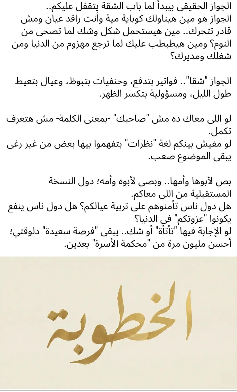 ظهر مؤخرًا منشور على مواقع التواصل الاجتماعي، يسلط الضوء على الخطوبة بشكل صريح، مؤكّدًا أنها ليست عرضًا للرومانسية أمام العالم، بل فترة اختبار حقيقية، فالزواج الحقيقي يبدأ عندما يغلق باب البيت، وتظهر المسؤوليات اليومية، من يقدم لك الدعم في التعب، ومن يتحمل مزاجك، ومن يشاركك أعباء الحياة والعمل والأطفال.