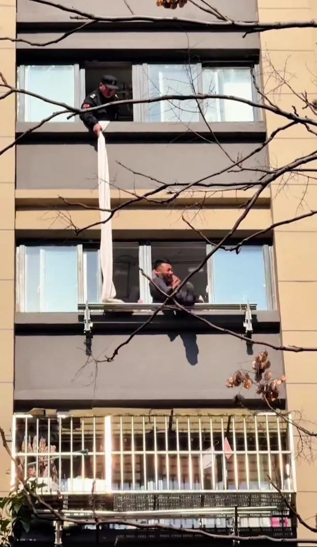 يُظهر المقطع المصور، تشانج وهو يمسك بحافة النافذة بينما يخفض نفسه، ويخطو على الحافة السفلية ويسحب الرجل المسن إلى داخل الشقة.