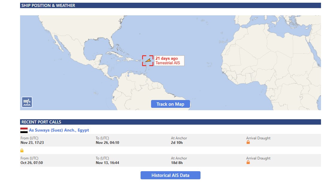 دخلت السفينة ميناء السويس يوم 26 أكتوبر 2025 وظلت راسية في الميناء حتى 13 نوفمبر من العام ذاته بإجمالي 18 يومًا و8 ساعات، وتكررت الزيارة في 23 نوفمبر 2025، بعد رحلة طويلة عبر البحر الأحمر، بقيت على مرسى السويس حتى 26 نوفمبر، أي لمدة 72 ساعة، في عمليات شحن وتفريغ النفط الخام، وفق بيانات AIS البحرية، وموقع vesselfinder المتخصص في تتبع ومراقبة حركة السفن حول العالم.