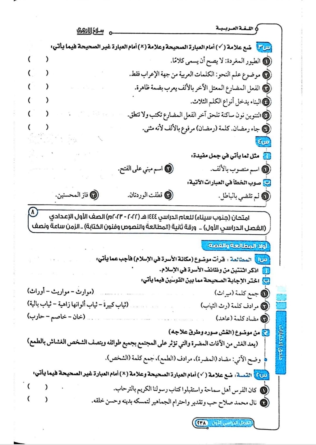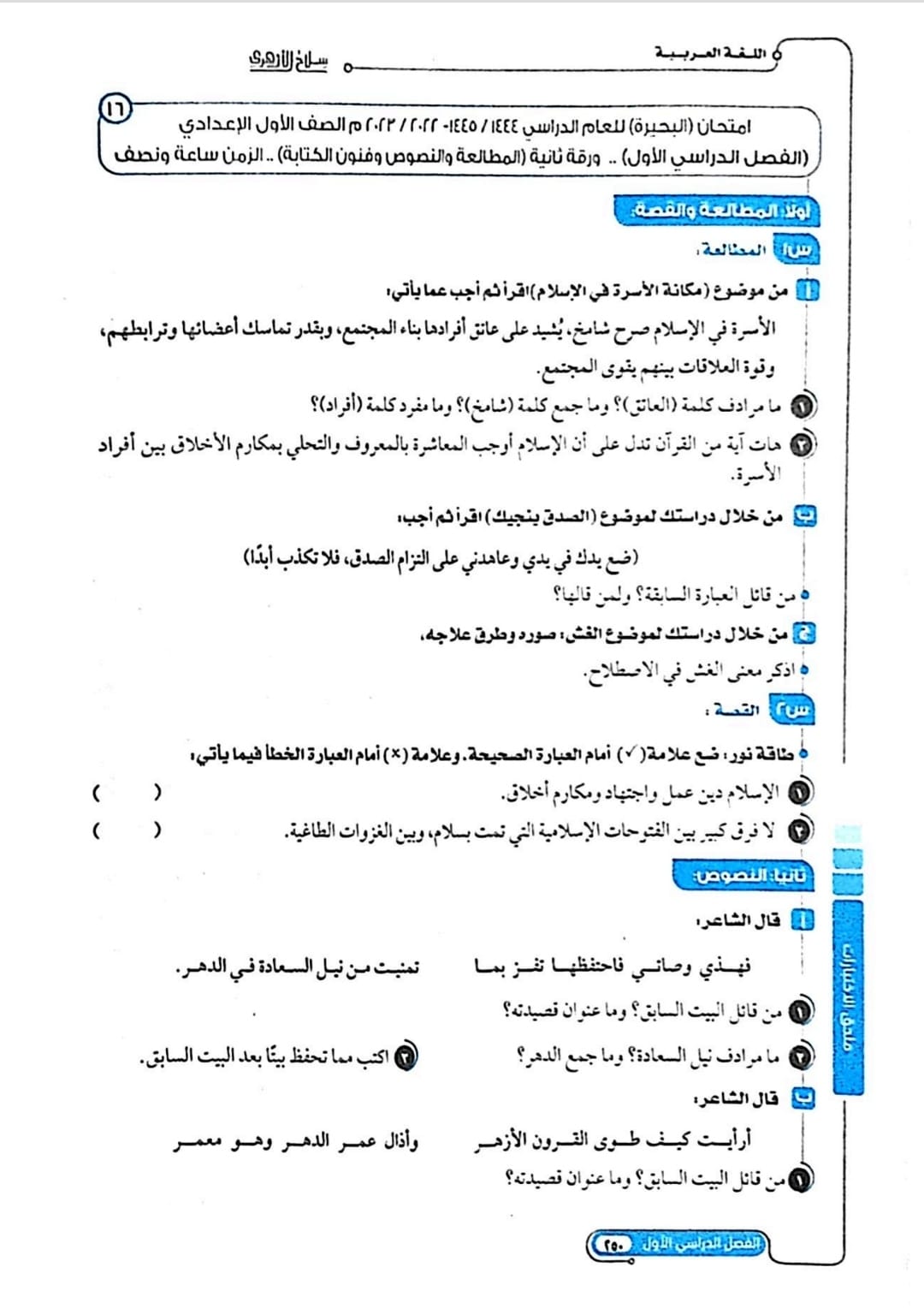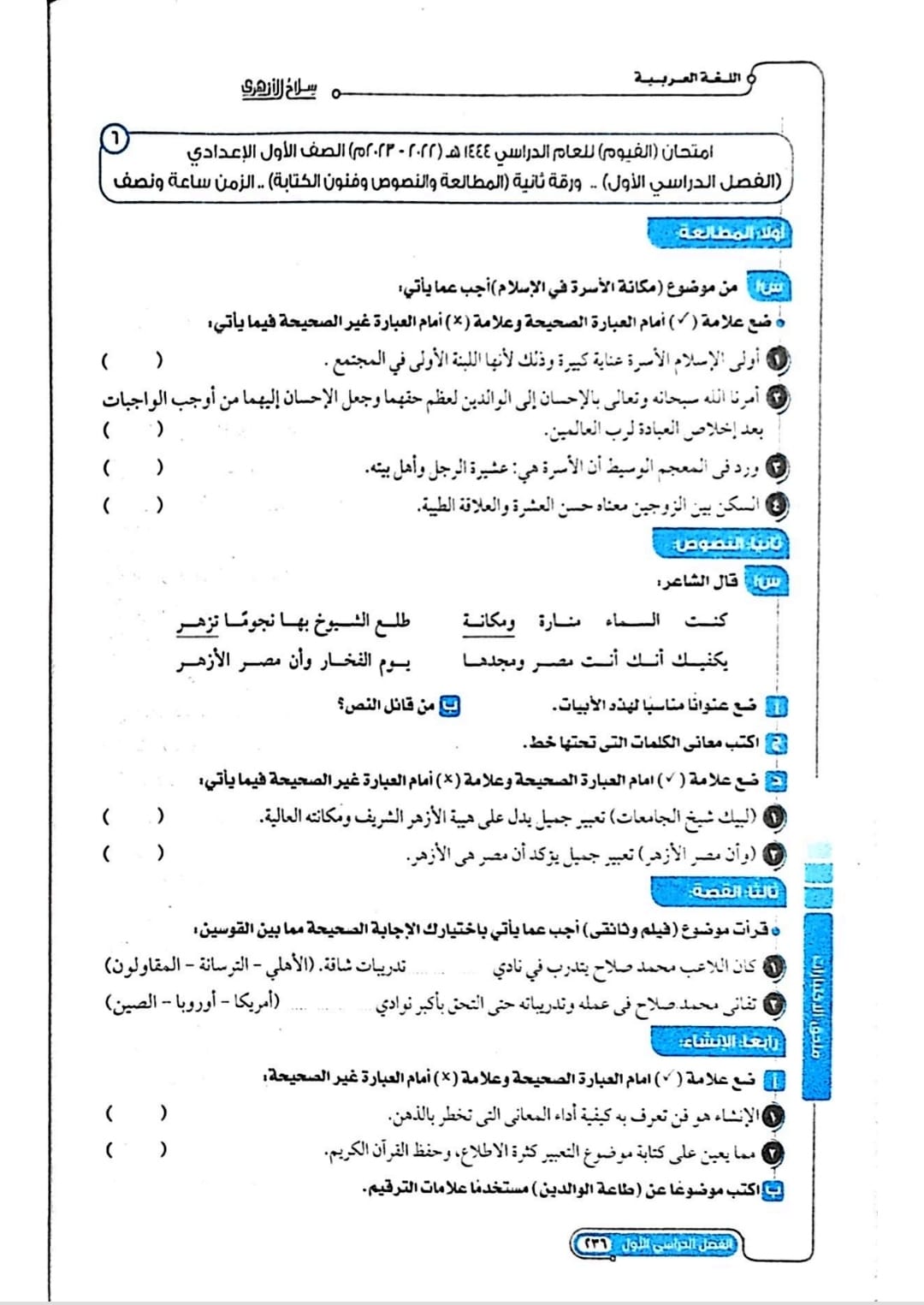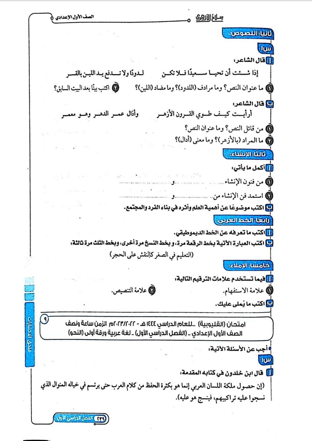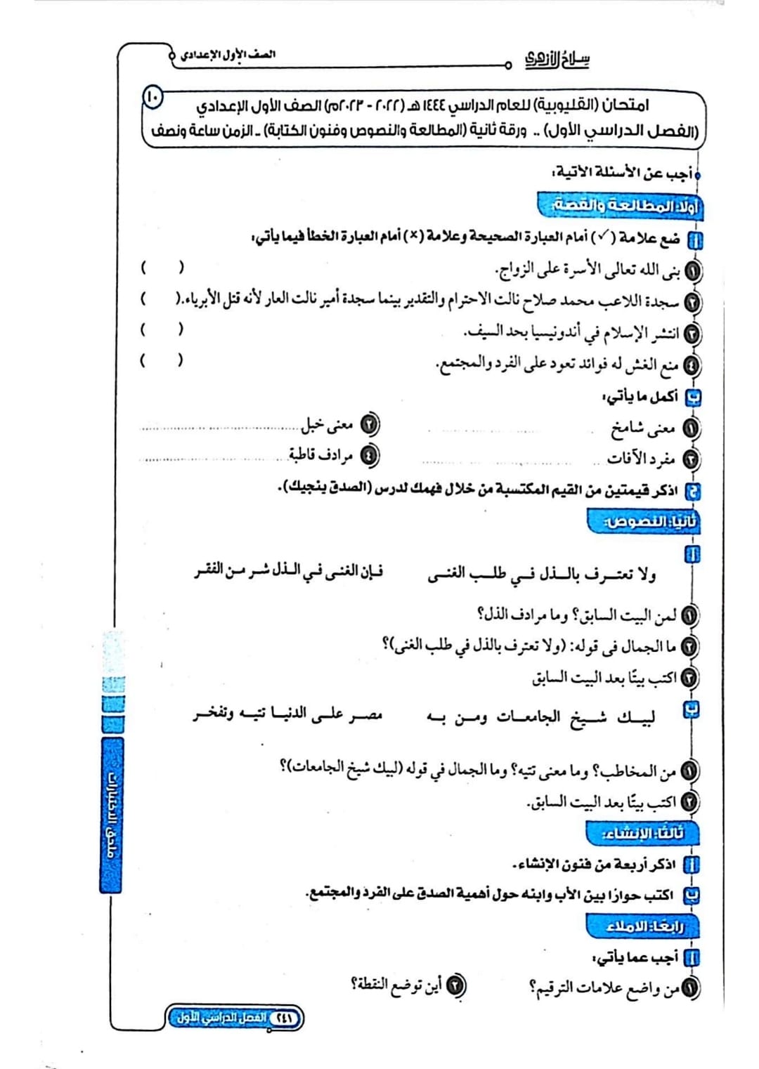 يستطيع الطلاب الان الاطلاع على نماذج امتحان المطالعة والنصوص للصف الأول الإعدادي الأزهري الترم الأول 2026 التي تعتمد على قياس مهارات الفهم والاستيعاب، والقدرة على تحليل النصوص الأدبية من خلال الصور التالية :