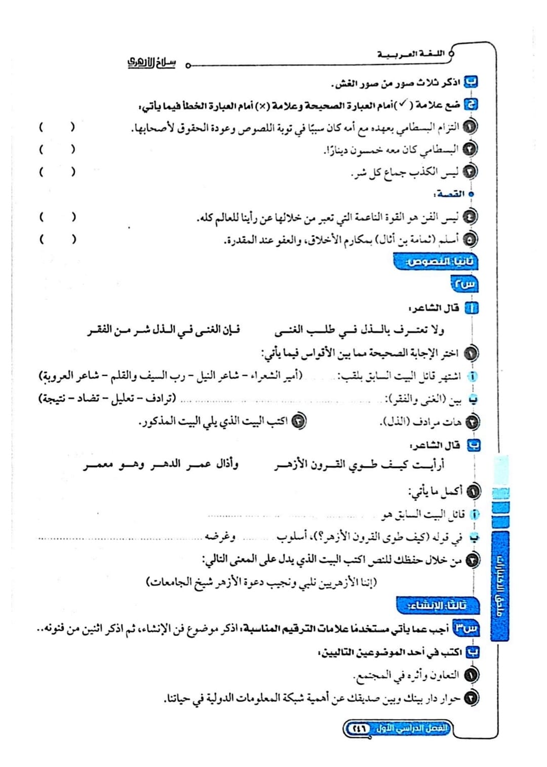امتحان مطالعة ونصوص للصف الأول الإعدادي الأزهري الترم الأول 2026، أسئلة متوقعة