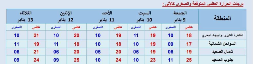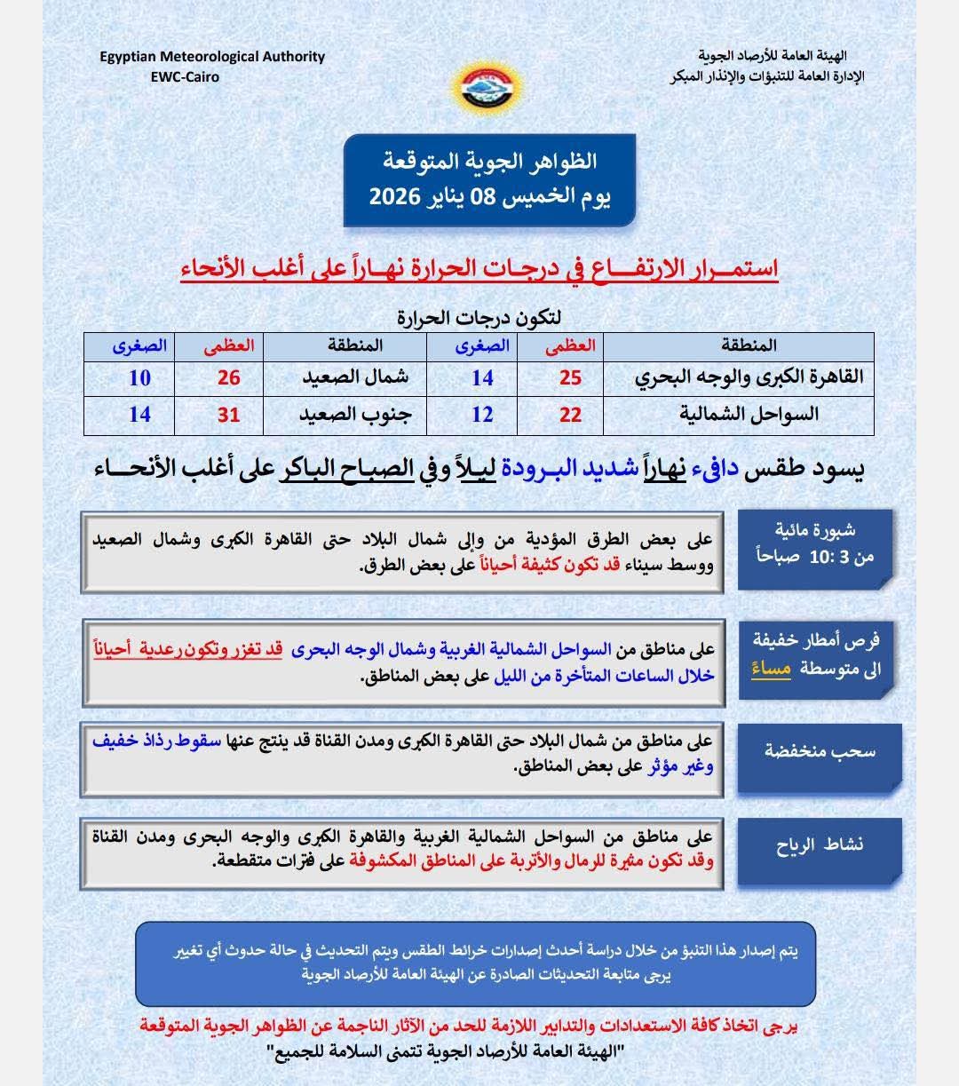 جاءت درجات الحرارة المتوقعة اليوم الخميس 8 يناير 2026 في مصر على النحو التالي: