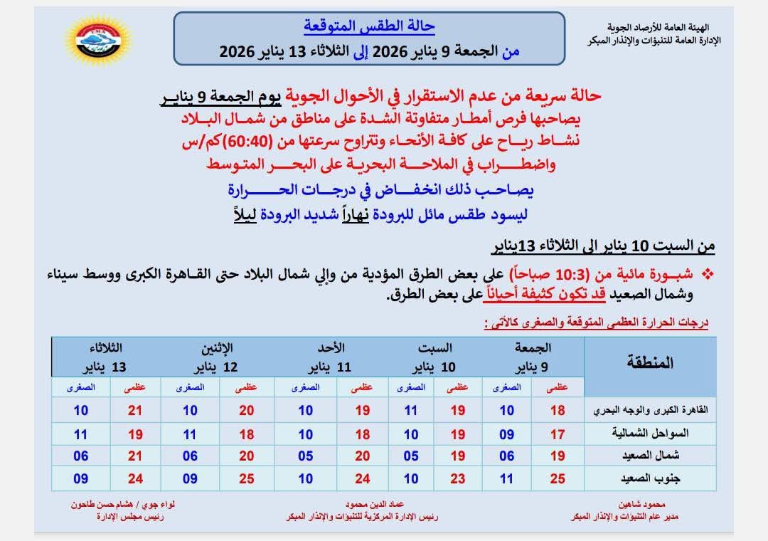 تشير توقعات هيئة الأرصاد إلى تعرض البلاد لـ حالة سريعة من عدم الاستقرار في الأحوال الجوية اعتبارًا من يوم الجمعة 9 يناير 2026، حيث تتأثر مناطق من شمال البلاد بـ فرص أمطار متفاوتة الشدة، يصاحبها نشاط رياح على كافة الأنحاء تتراوح سرعتها بين 40 و60 كم/س.