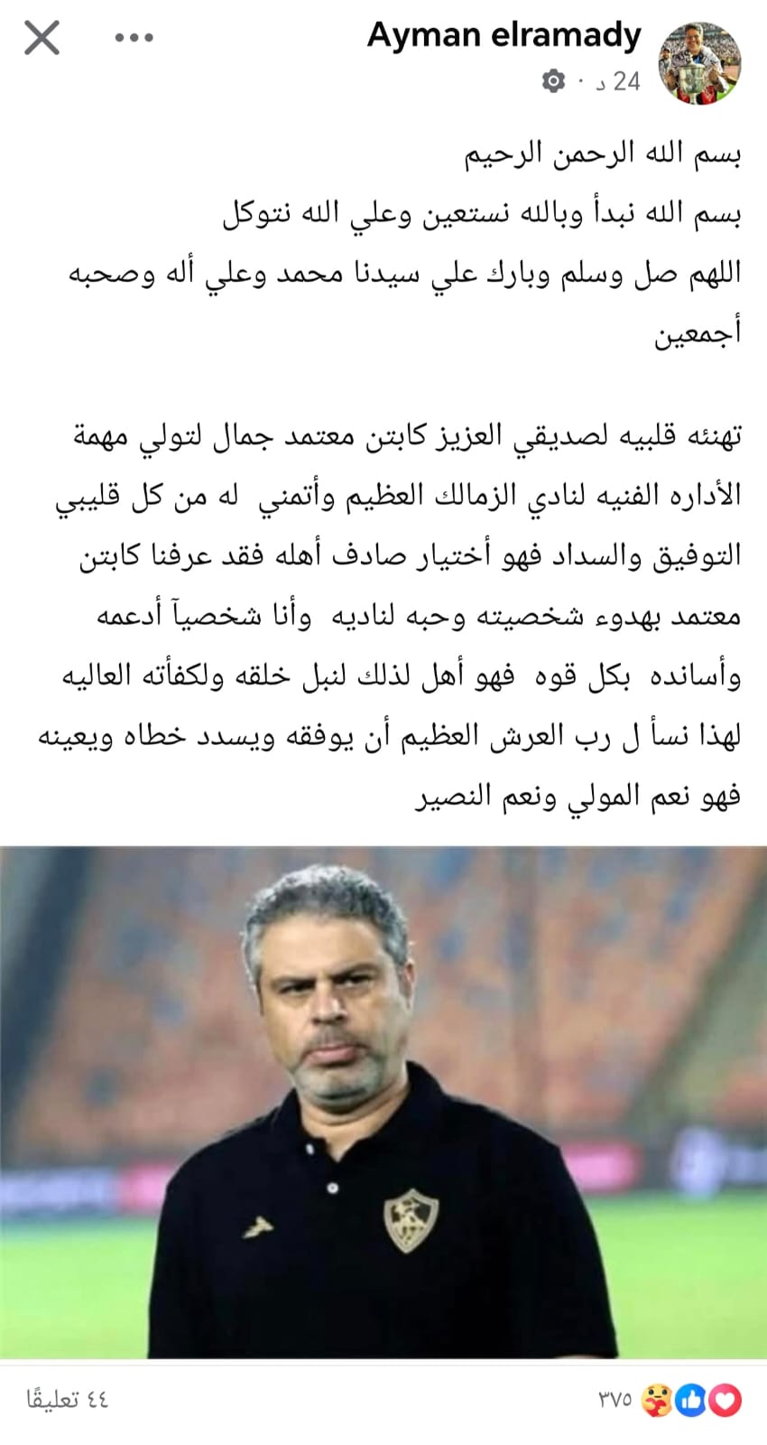 وأضاف: “تهنئة قلبية لصديقي العزيز كابتن معتمد جمال لتولي مهمة الإدارة الفنية لنادي الزمالك العظيم وأتمني له من كل قلبي التوفيق والسداد، فهو اختيار صادف أهله، فقد عرفنا كابتن معتمد بهدوء شخصيته وحبه لناديه،”.