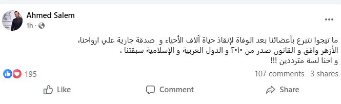 ونشر أحمد سالم منشورًا عبر حسابه الرسمي على موقع فيسبوك، قال فيه:"ما تيجوا نتبرع بأعضائنا بعد الوفاة لإنقاذ حياة آلاف الأحياء و صدقة جارية علي أرواحنا، الأزهر وافق والقانون صدر من 2010 والدول العربية والإسلامية سبقتنا، واحنا لسة مترددين !!!".