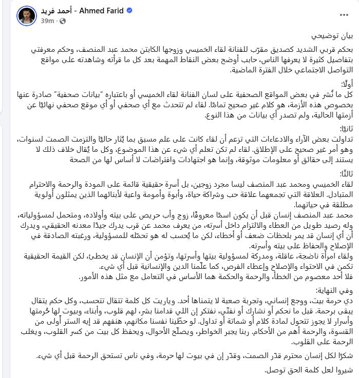وأكد فريد أن لقاء الخميسي ومحمد عبدالمنصف تجمعهما علاقة أسرية قائمة على المودة والاحترام والشراكة، وأن أبناءهما يمثلون أولوية قصوى في حياتهما، لافتًا إلى أن عبدالمنصف إنسان قبل أن يكون اسمًا معروفًا، يتحمل مسؤولياته كزوج وأب، ولديه رغبة حقيقية في الحفاظ على أسرته.