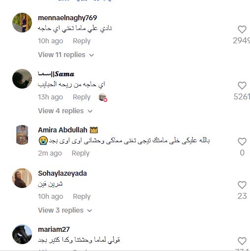 وقالت أخرى: "إحساسها زي إحساس أمها"، فيما قالت أميرة عبدالله، "بالله عليكي خلي ماما تيجي تغني معاكي، وحشاني أوي أوي بجد"، إلى جانب تعليقات أخرى مثل: "شيرين فين؟" و"قولي لماما وحشتنا كتير".