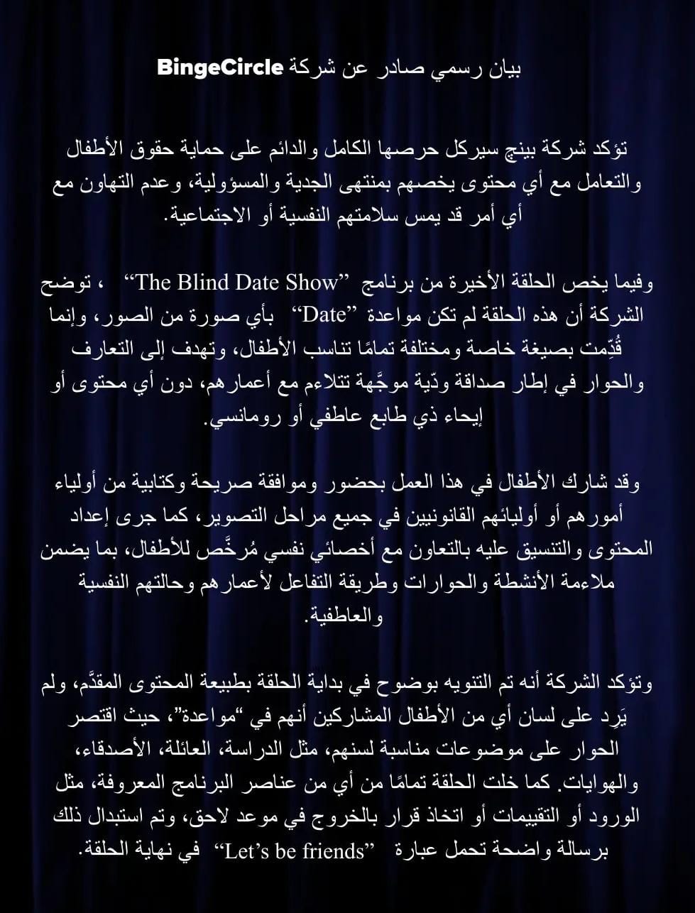 وأصدرت شركة BingeCircle أول تعليق رسمي بشأن مشاركة الأطفال في برنامج Blind Date Show، مؤكدة أن جميع المشاركين ممثلون محترفون معتادون على الظهور الإعلامي، وأن مشاركتهم تمت بعد شرح كامل لطبيعة العمل والحصول على موافقة صريحة من أولياء أمورهم.