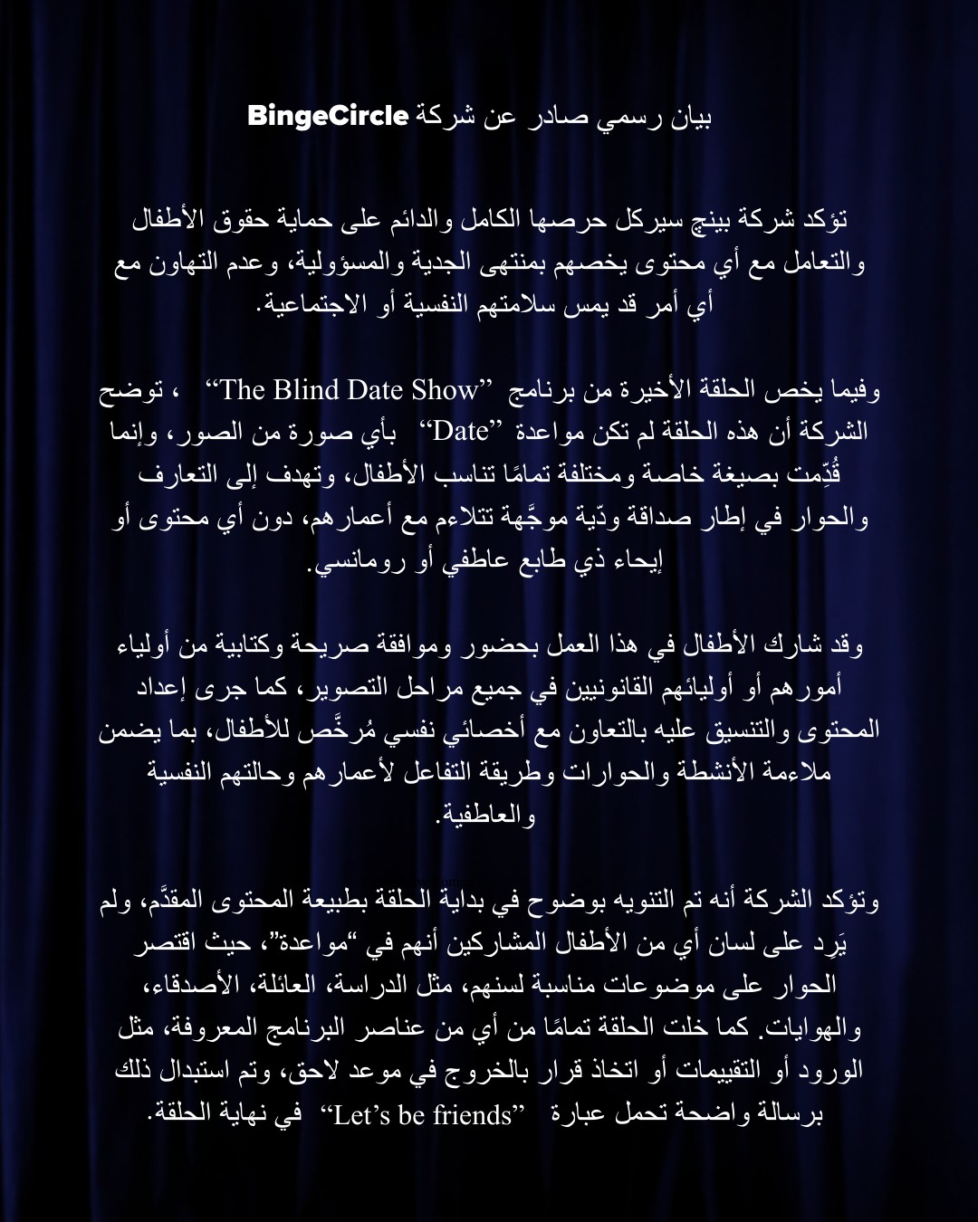 وفيما يخص الحلقة الأخيرة من برنامج The Blind Date Show، أوضحت الشركة، أن هذه الحلقة لم تكن مواعدة "Date" بأي صورة من الصور، وإنما قدمت بصيغة خاصة ومختلفة تمامًا تناسب الأطفال، وتهدف إلى التعارف والحوار في إطار صداقة ودية موجهة تتلاءم مع أعمارهم دون أي محتوى أو إيحاء ذي طابع عاطفي أو رومانسي.