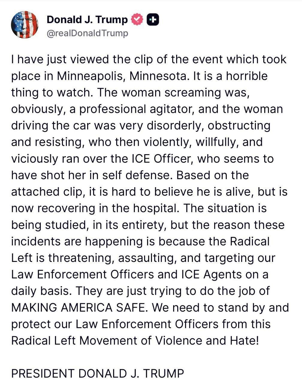 ومن جانبه، رد ترامب على الحادث عبر" تروث سوشيال" وكتب: " لقد شاهدت للتو مقطع الفيديو للحدث الذي وقع في مينيابوليس، مينيسوتا، إنه أمر مروع، من الواضح أن المرأة التي كانت تصرخ كانت محرضة محترفة، وكانت المرأة التي تقود السيارة فوضوية للغاية، تعرقل وتقاوم، ثم دهست بعنف وعمد وبوحشية ضابط إدارة الهجرة والجمارك، الذي يبدو أنه أطلق النار عليها دفاعًا عن النفس.