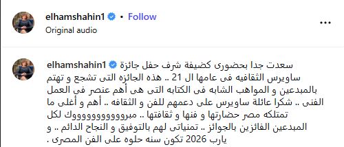 وتابعت: "شكرًا لعائلة ساويرس على دعمهم للفن والثقافة، فهما من أغلى وأهم ما تمتلكه مصر. مبروك لكل المبدعين الفائزين بالجوائز، مع تمنياتي لهم بالتوفيق والنجاح الدائم، ويا رب تكون 2026 سنة حلوة على الفن المصري".