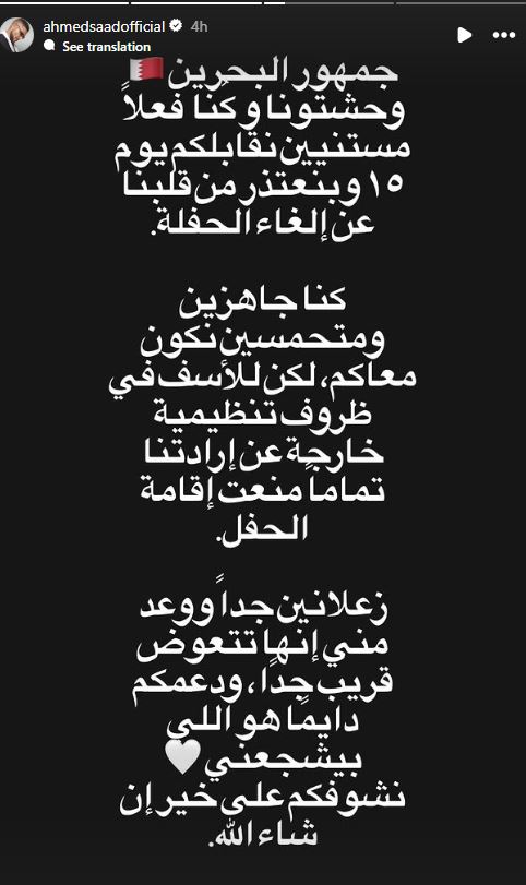 ونشر أحمد سعد عبر خاصية "الاستوري" على "إنستجرام" منشورًا، قال فيه: "جمهور البحرين وحشتونا، وكنا فعلًا متشوقين نلتقي بكم يوم 15، ونعتذر من قلوبنا عن إلغاء الحفل".