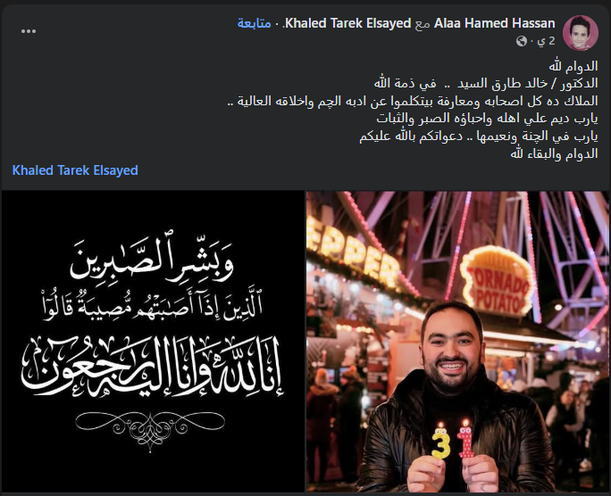 وأعاد المتابعون تداول آخر منشور لـ الطبيب خالد طارق السيد، الذي تحدث فيه عن زيارة جده له في المنام، وذلك بعد إعلان وفاة الشاب بشكل مفاجئ خارج مصر أثناء دراسته للطب في لندن.