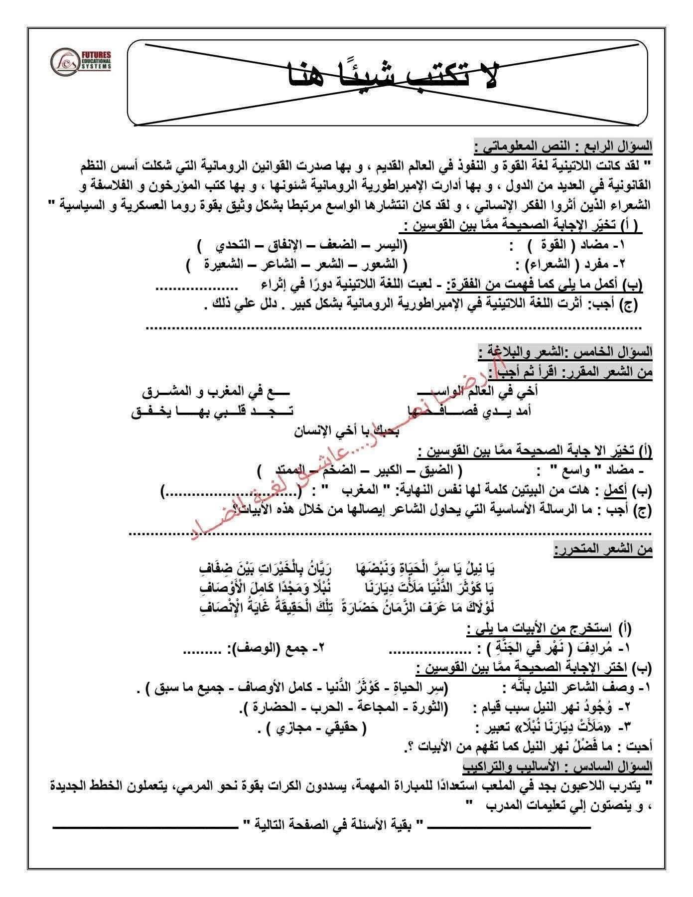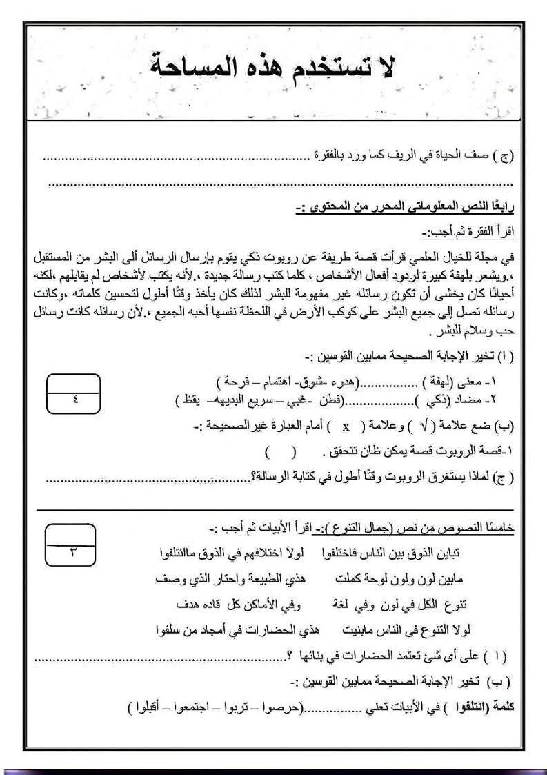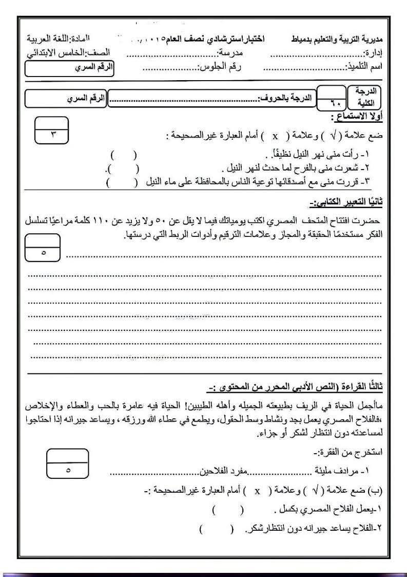 نماذج امتحانات اللغة العربية للصف الخامس الابتدائي
