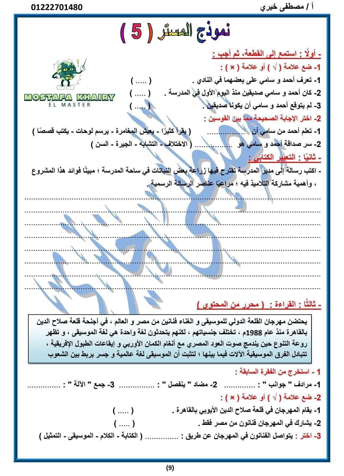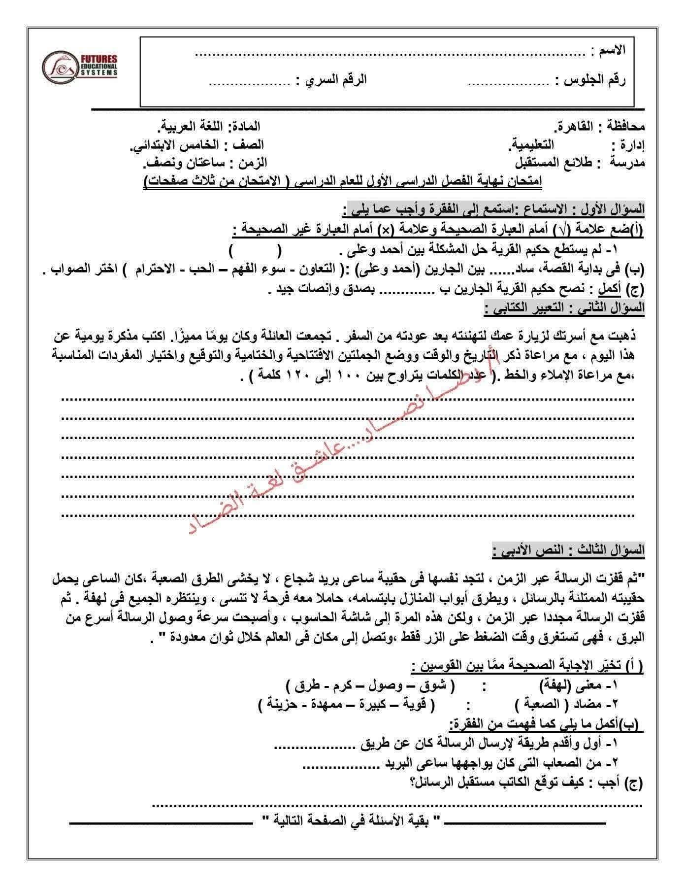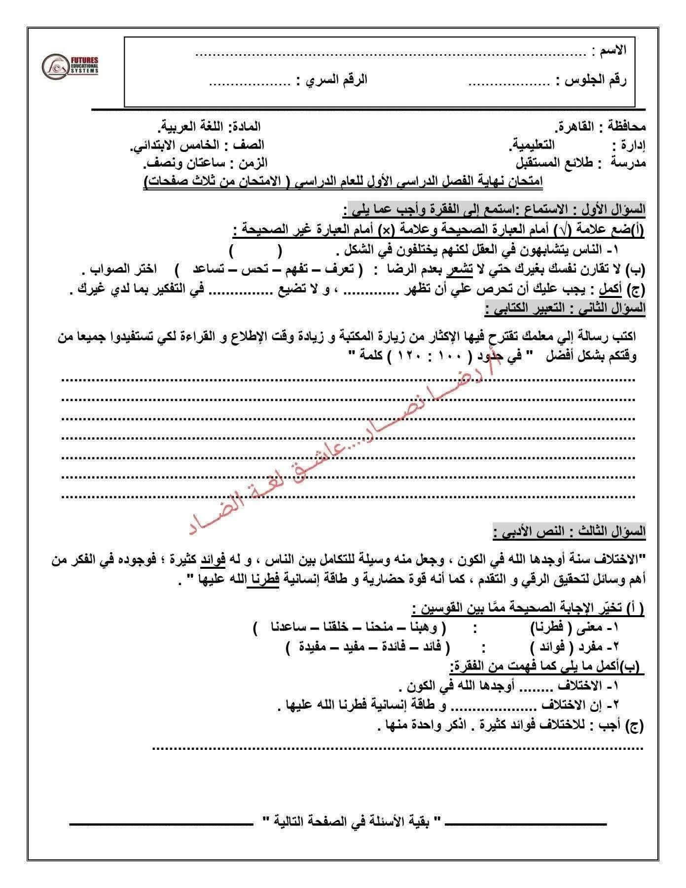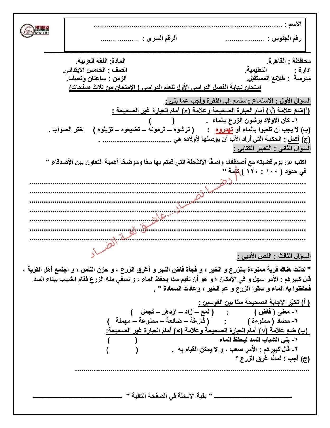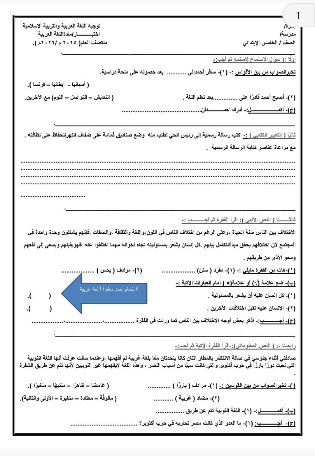 نماذج امتحان اللغة العربية للصف الخامس الابتدائي الترم الأول