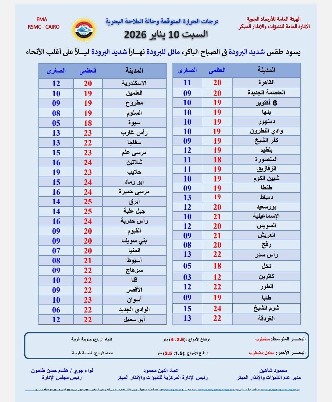 ونستعرض خلال السطور التالية درجات الحرارة المتوقعة اليوم السبت 10 يناير 2026 في أغلب أنحاء الجمهورية:
