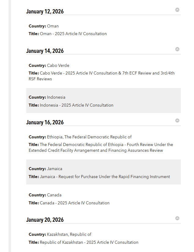 وبحسب جدول الأعمال المنشور على الموقع الإلكتروني لصندوق النقد الدولي، والذي خضع للتحديث مؤخرًا، فإن الدول المقرر مناقشة برامجها خلال الفترة من 12 يناير وحتى 20 يناير الجاري تشمل عُمان، إندونيسيا، إثيوبيا، جامايكا، كندا، وكازاخستان، دون الإشارة إلى إدراج مصر ضمن هذه الاجتماعات.