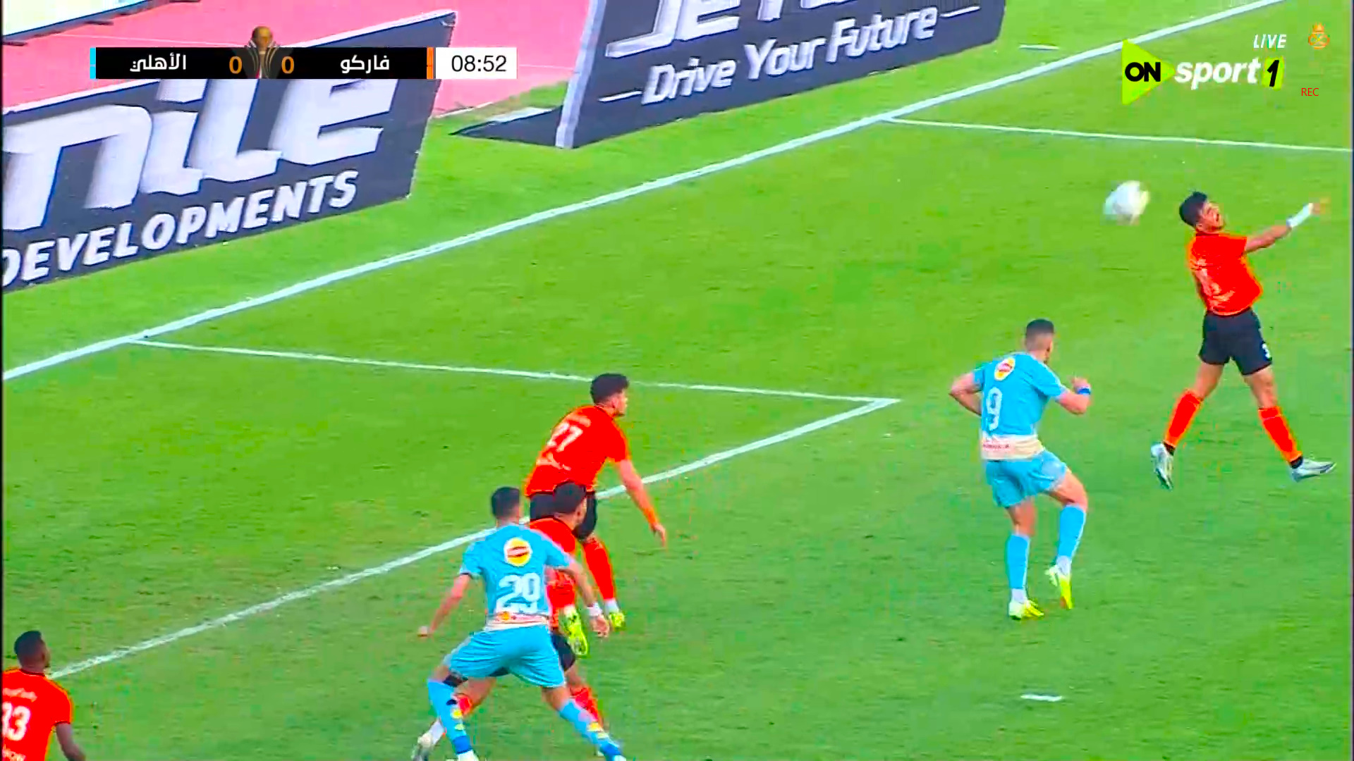 الدقيقة 9: عرضية رائعة من إبراهيم الأسيوطي، لاعب الأهلي، لجراديشار، الذي قابلها برأسه ووجهها ولكن علت مرمى فاركو.