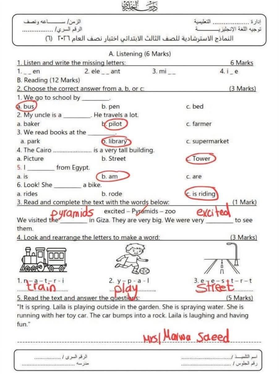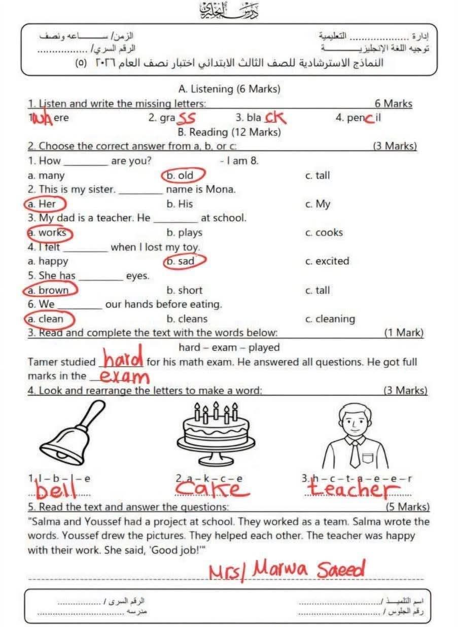 نماذج امتحان إنجليزي للصف الثالث الابتدائي الترم الأول 2026