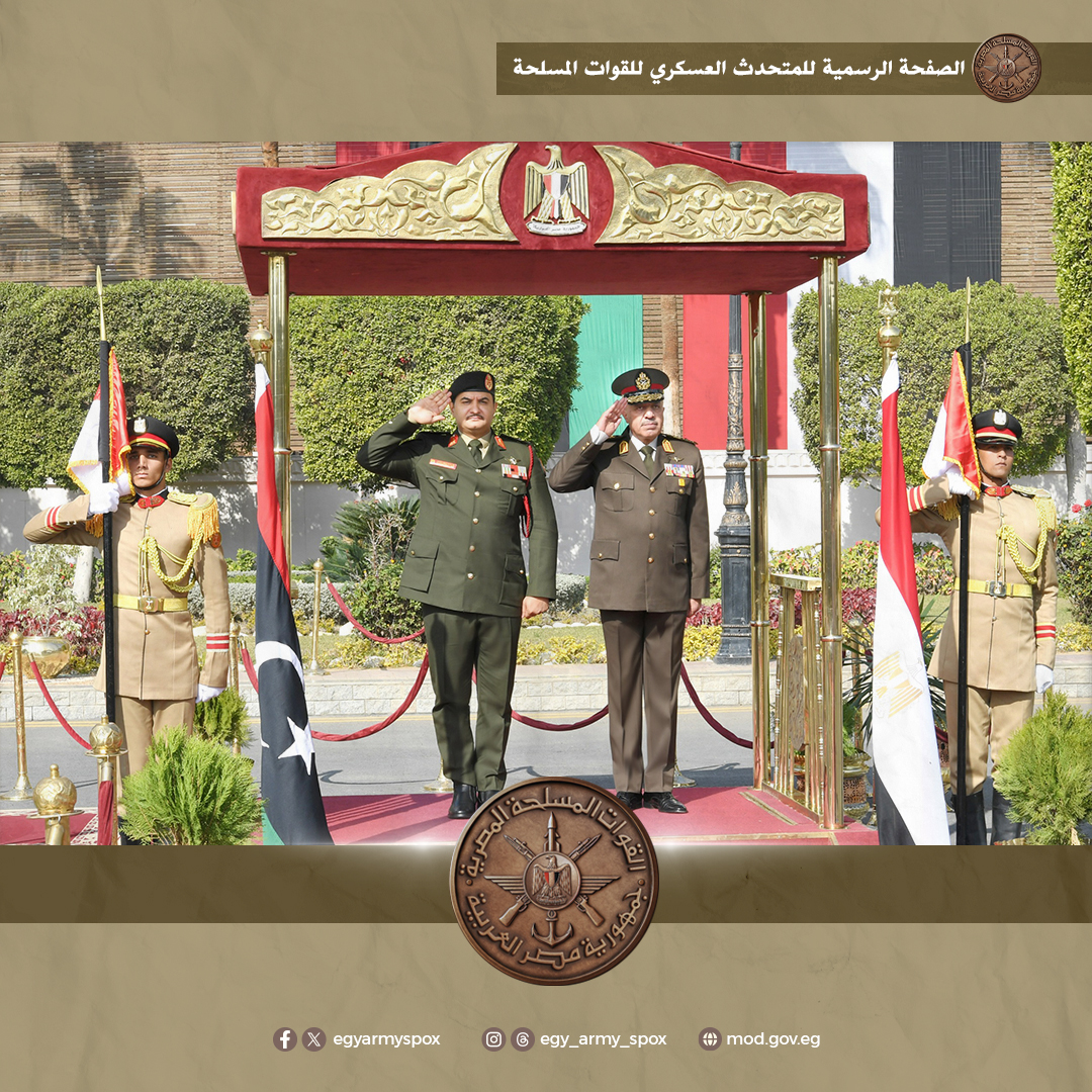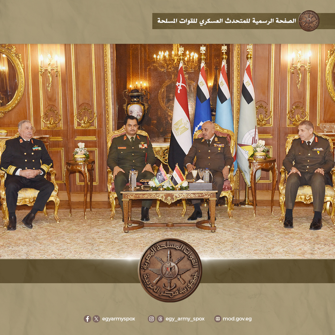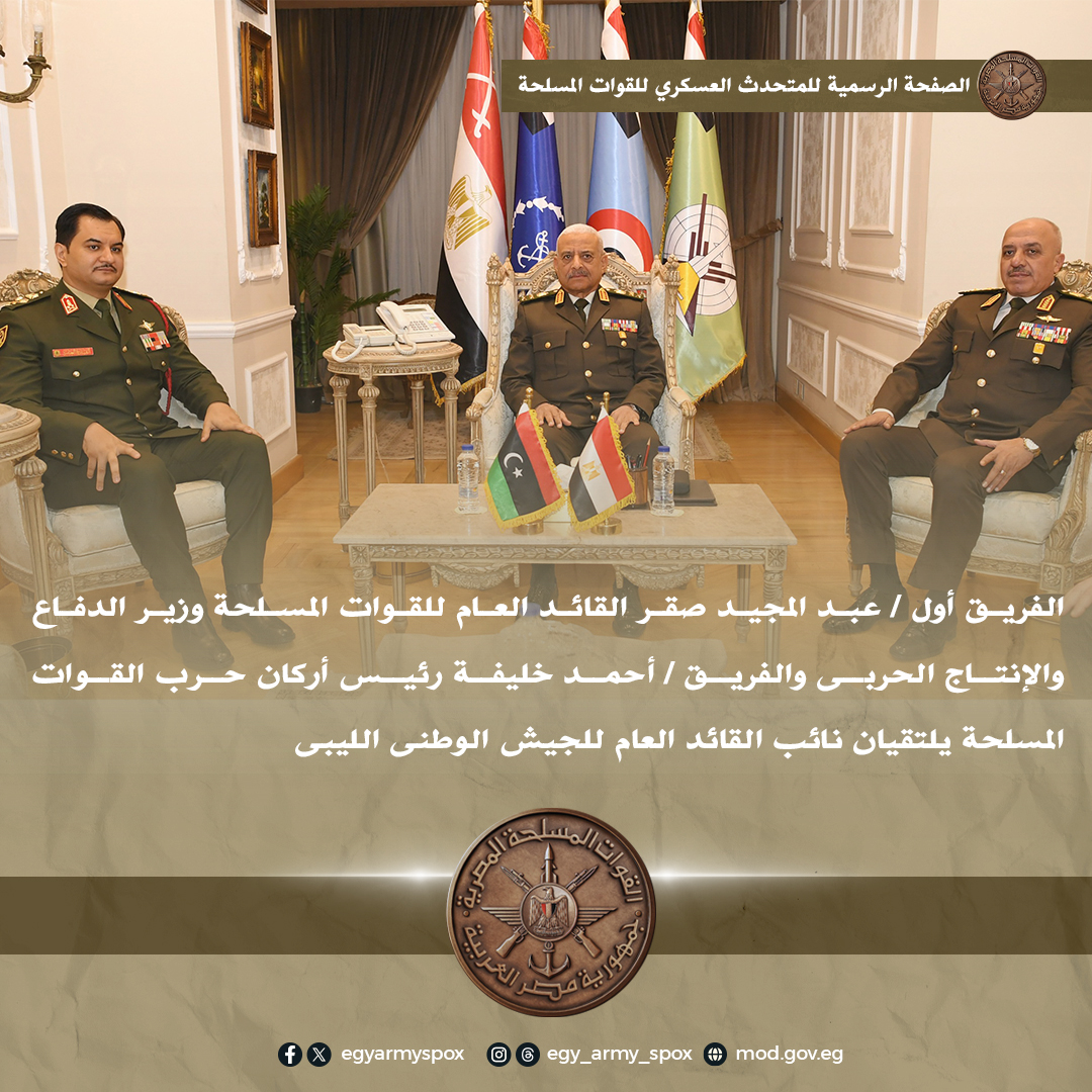 وفى سياق متصل، التقى رئيس أركان حرب القوات المسلحة، الفريق أحمد خليفة، نائب القائد العام للجيش الوطنى الليبى، حيث أجريت له مراسم استقبال رسمية بمقر الأمانة العامة لوزارة الدفاع وعزفت الموسيقات العسكرية السلام الوطنى لكلا البلدين.