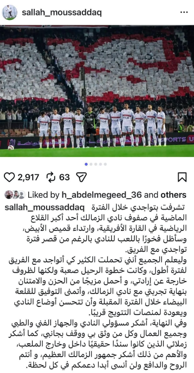 ودّع اللاعب المغربي صلاح الدين مصدق جماهير نادي الزمالك برسالة مؤثرة عبر حسابه الرسمي على موقع إنستجرام، عبّر فيها عن فخره بتجربته مع القلعة البيضاء، رغم قصر فترة تواجده ضمن صفوف الفريق.