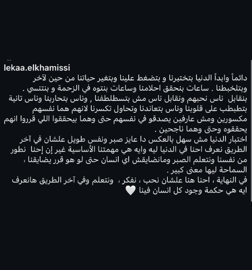 وكتبت لقاء الخميسي عبر "إنستجرام": “دائما وأبدًا الدنيا بتختبرنا وبتضغط علينا وبتغير حياتنا من حين لآخر وبتلخبطنا، ساعات بنحقق أحلامنا وساعات بنتوه في الزحمة وبنتنسي، بنقابل ناس نحبهم، ونقابل ناس مش بتسطلطفنا”.