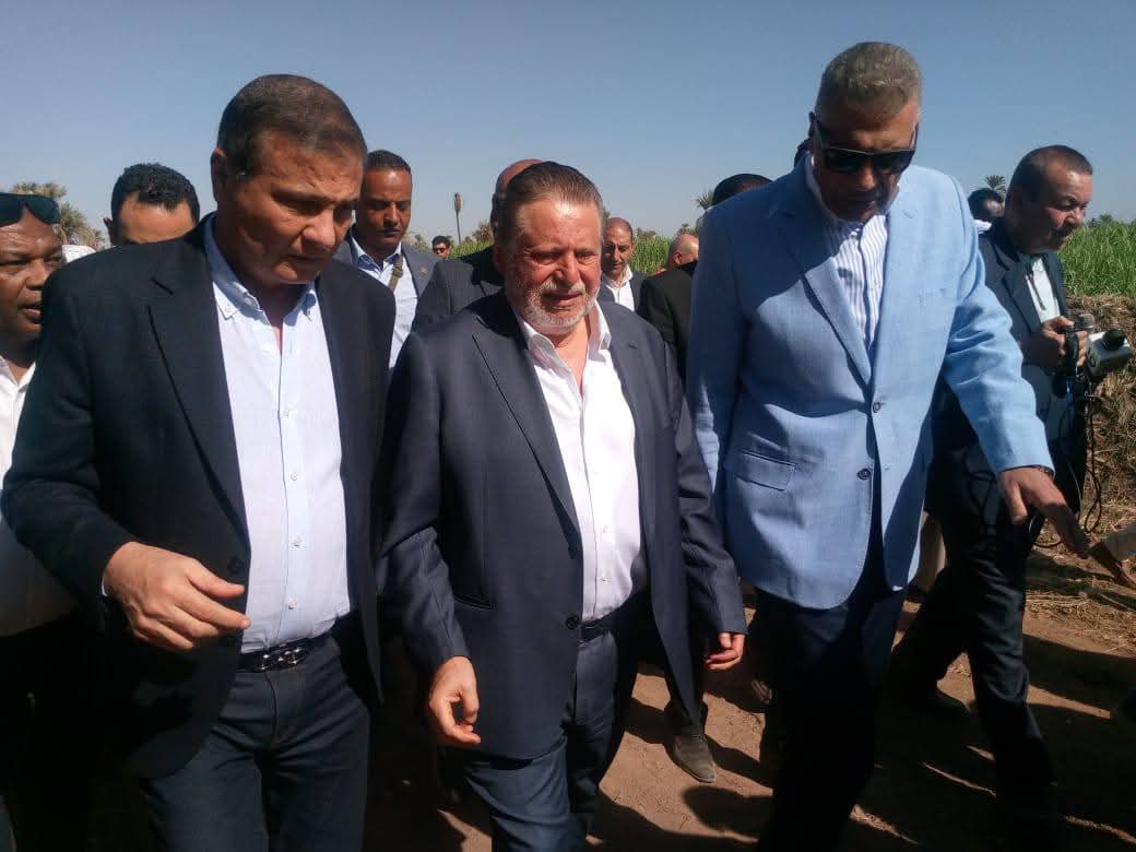 محافظ البنك المركزى ووزير الزراعة ومحافظ أسوان يتفقدون نموذج زراعة قصب السكر بطريقة الشتل تحت نظام الرى بالتنقيط والطاقة الشمسية