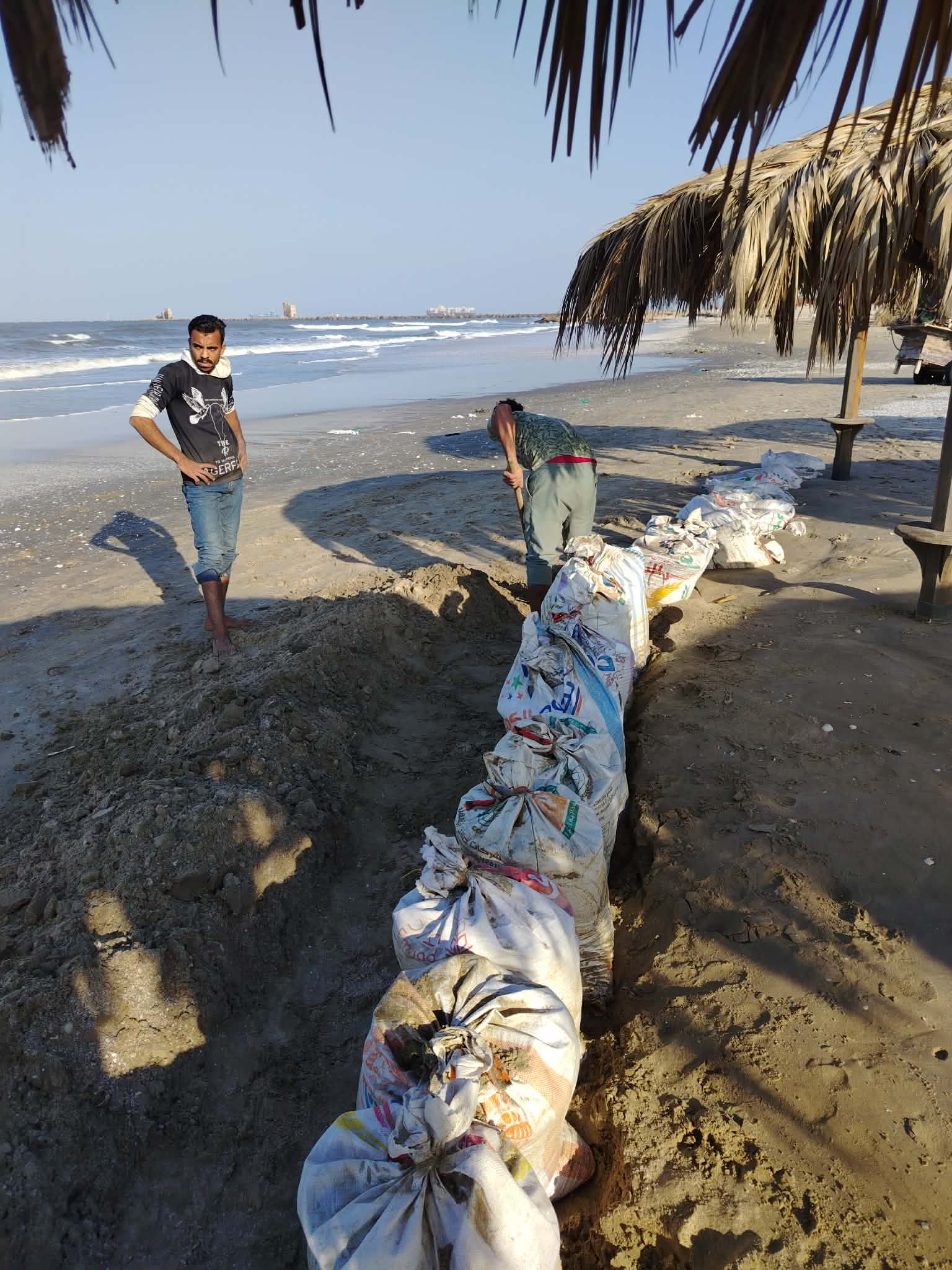استغل الشاب الرمال الناتجة عن الحفر، ووضعها داخل أجولة من الخيش، ثم رصّها داخل المجرى بشكل منظم، لتعمل كحاجز أمواج بسيط وفعّال، يمتص مياه الأمطار ويسحب اندفاع المياه، ويمنع وصولها إلى الشماسي والمنشآت داخل الشاطئ.