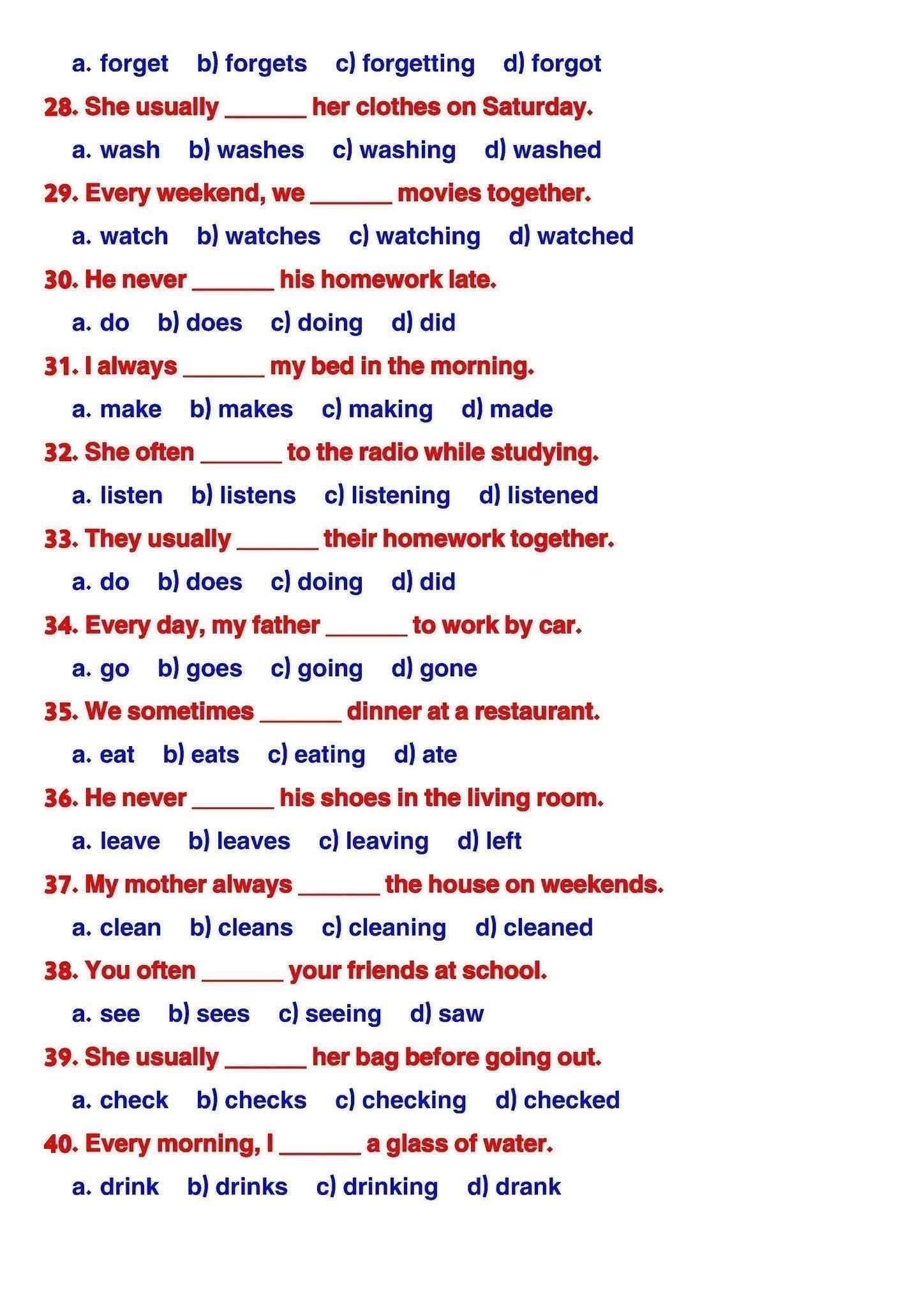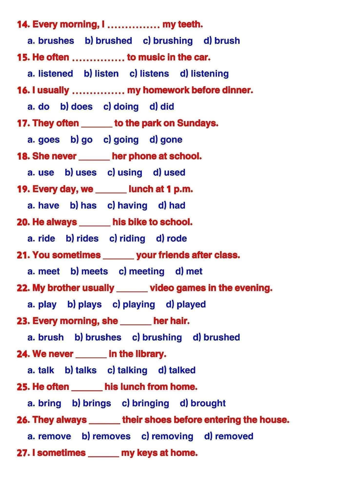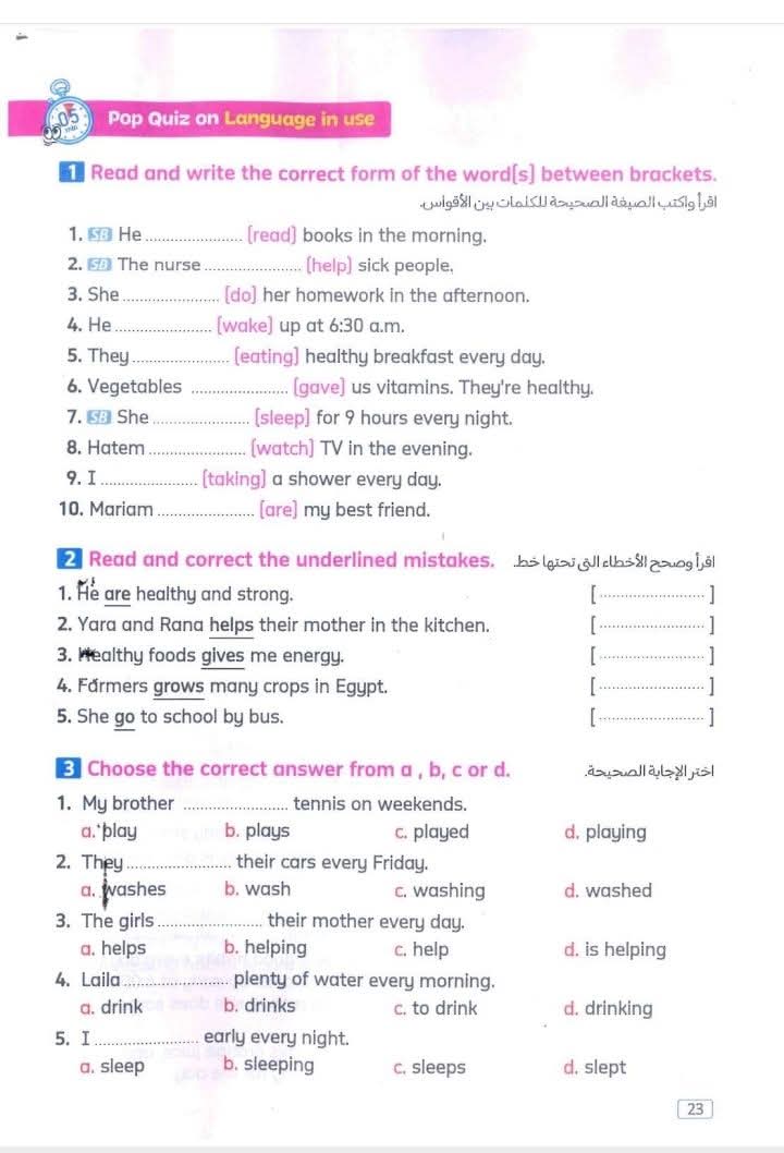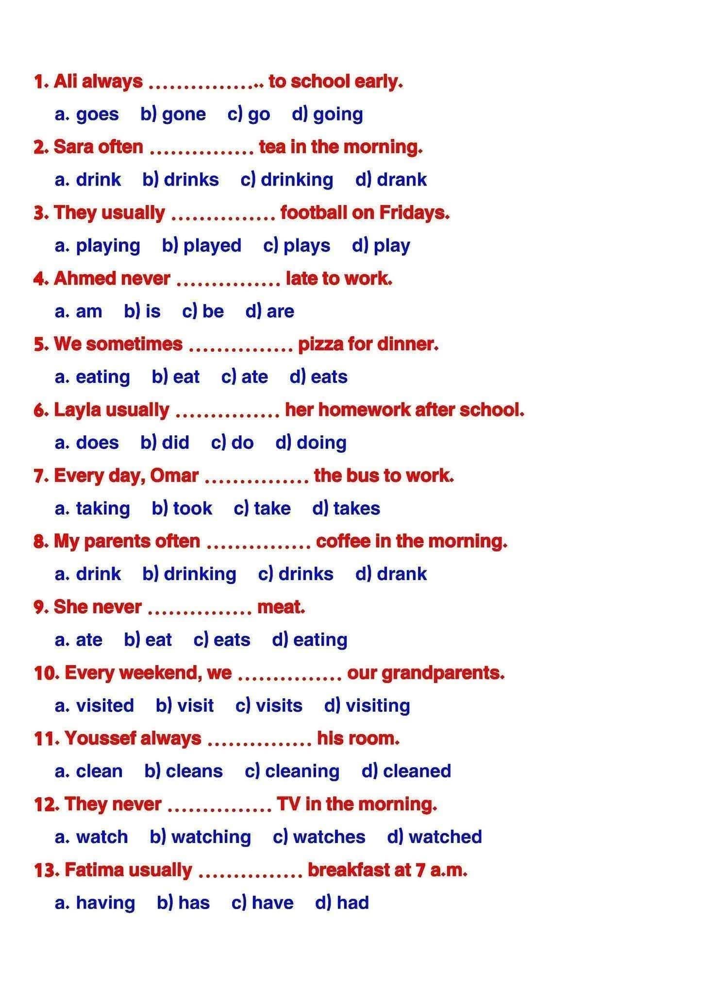 تدريبات على درس المضارع البسيط للصف الرابع الابتدائي