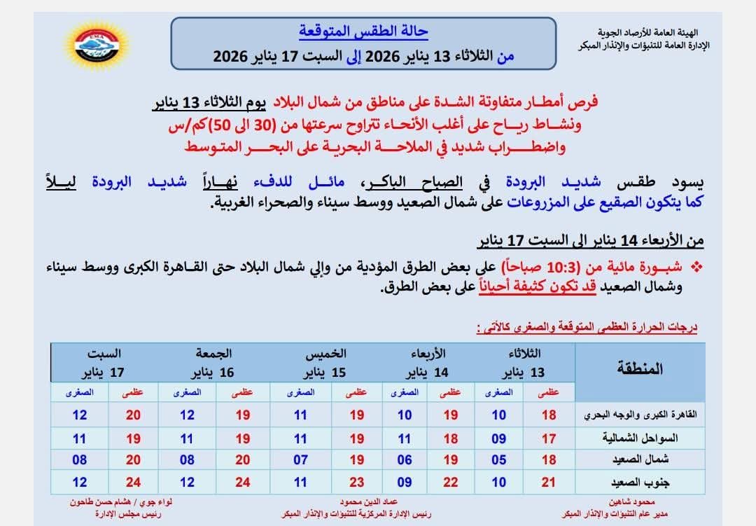 وأوضحت الهيئة العامة للأرصاد الجوية أن البلاد ستشهد خلال الفترة من الثلاثاء 13 يناير حتى السبت 17 يناير 2026 طقسًا شديد البرودة في ساعات الصباح الباكر، مع جو مائل للبرودة خلال النهار، ويعاود الانخفاض ليلًا، كما سيحدث صقيع على المزروعات في شمال الصعيد ووسط سيناء والصحراء الغربية.