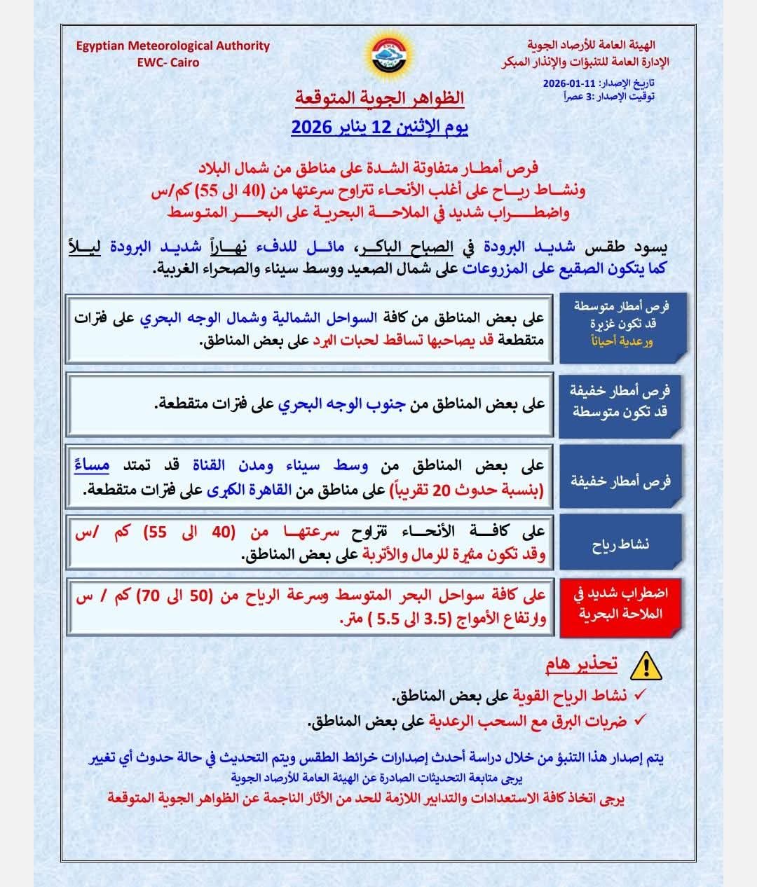 وفيما يخص حالة الطقس المتوقعة اليوم الإثنين 12 يناير 2026 في مصر فإنه وفقًا لتوقعات الهيئة العامة للأرصاد الجوية من المقرر أن يسود طقس شديد البرودة في الصباح الباكر مائل للدفء نهارًا وشديد البرودة ليلًا.