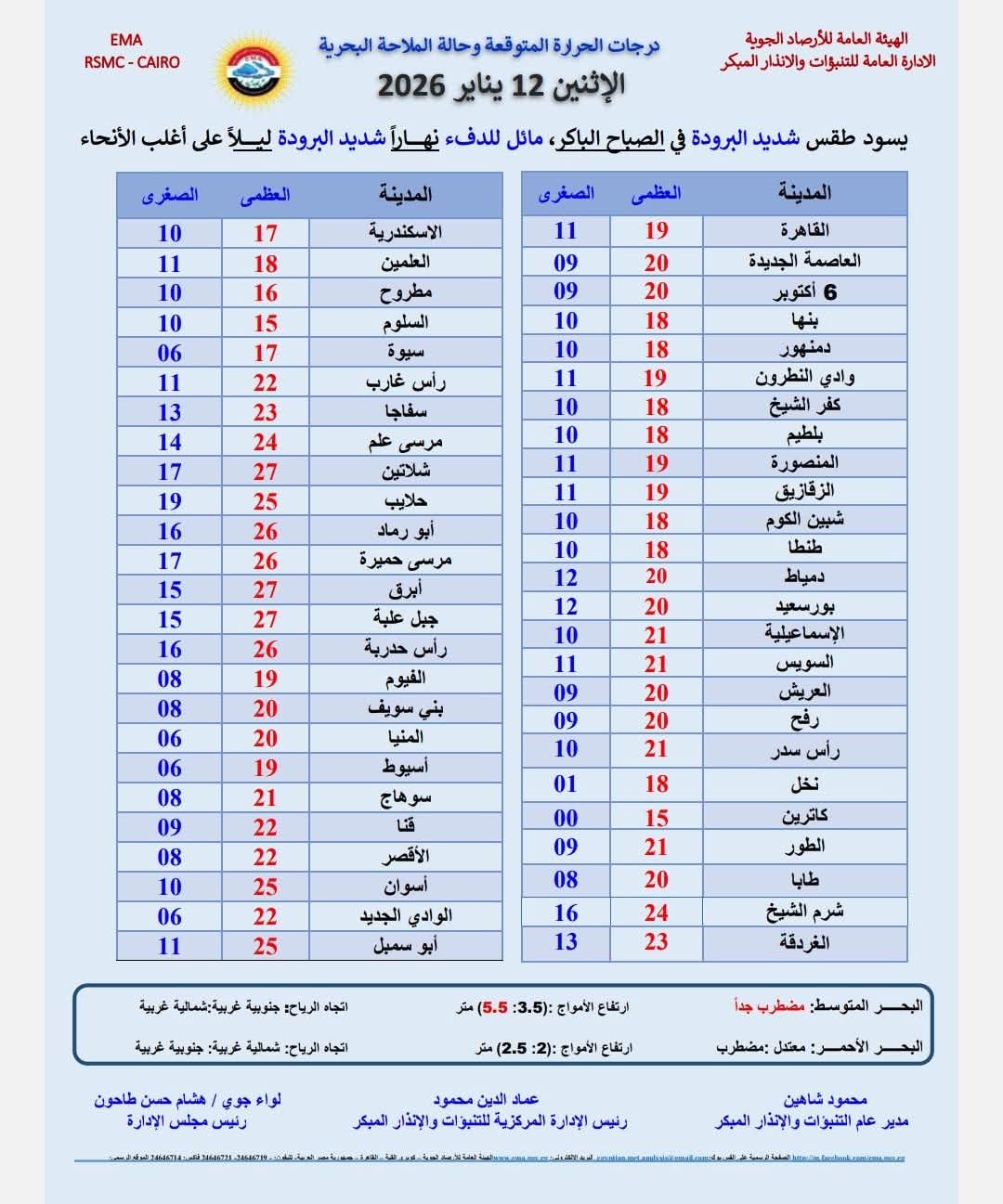 ونستعرض خلال الصورة التالية درجات الحرارة في مختلف أنحاء الجمهورية بمصر اليوم الإثنين 12 يناير 2026: