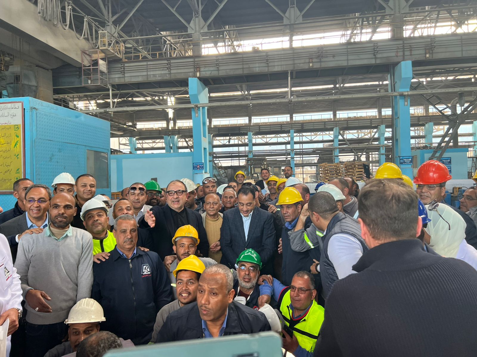 رئيس الوزراء يتفقد مصنع الألومنيوم بنجع حمادي ويلتقط صورًا تذكارية مع العمال