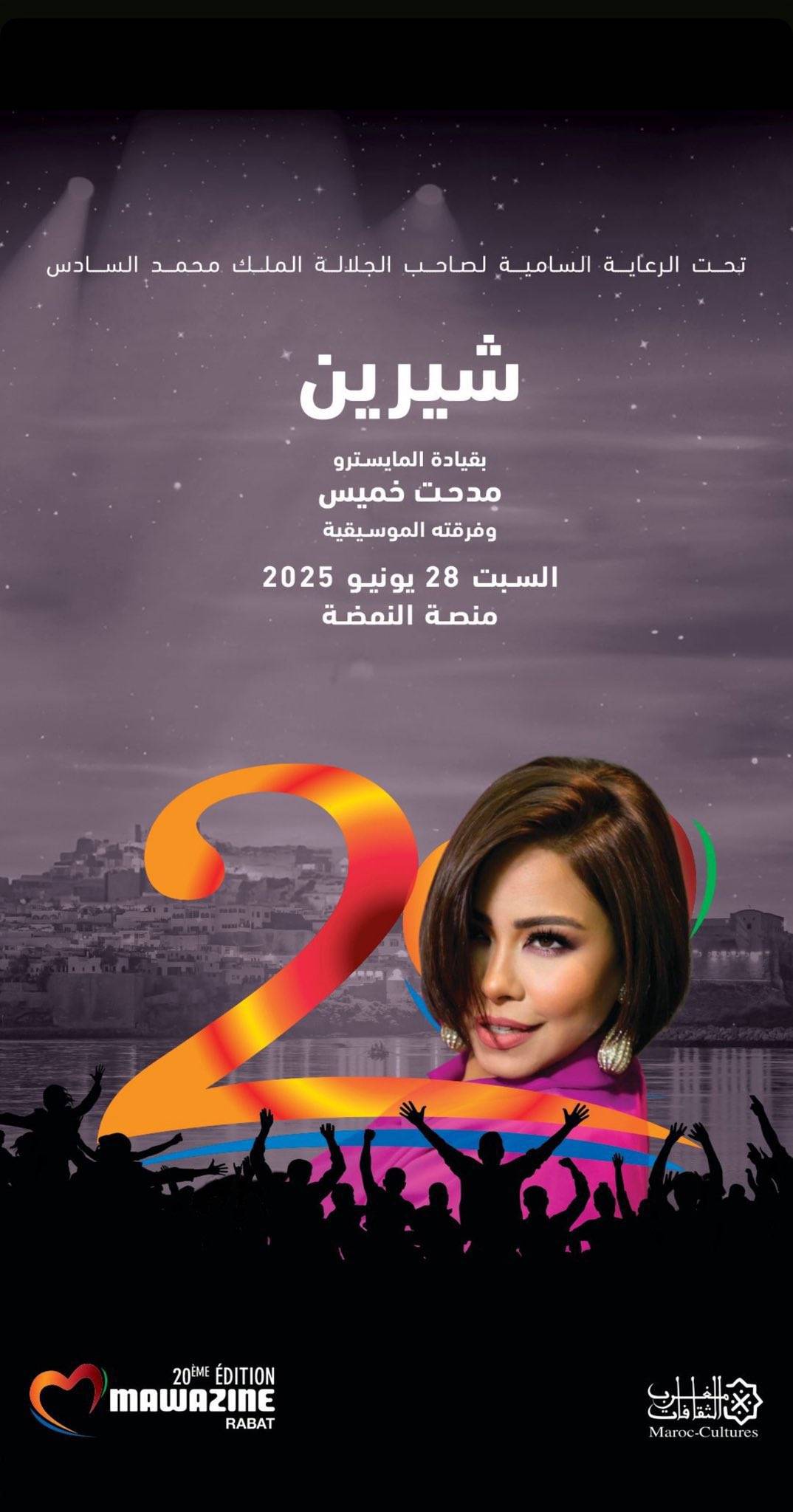 في الدورة العشرين من المهرجان، أحييت شيرين الحفل الختامي بعد غيابها عنه لمدة 9 سنوات، لكنها لاقت هجومًا واسعًا من الجمهور المغربي، وواجهت انتقادات عدة بسبب أدائها على المسرح، حيث قدمت أولى أغنياتها "نساي" وميدلي لبعض أغانيها بطريقة البلاي باك، في ظل حضور جمهوري كبير، حيث رفع الحفل لافتة "كامل العدد".
