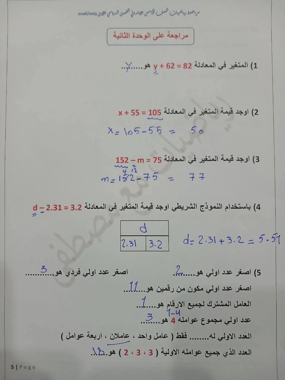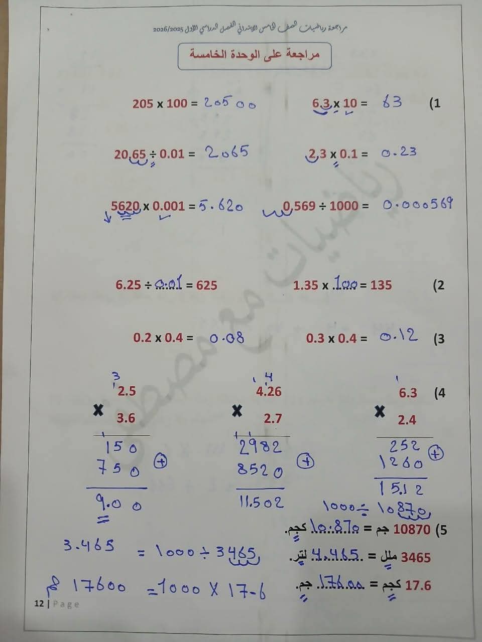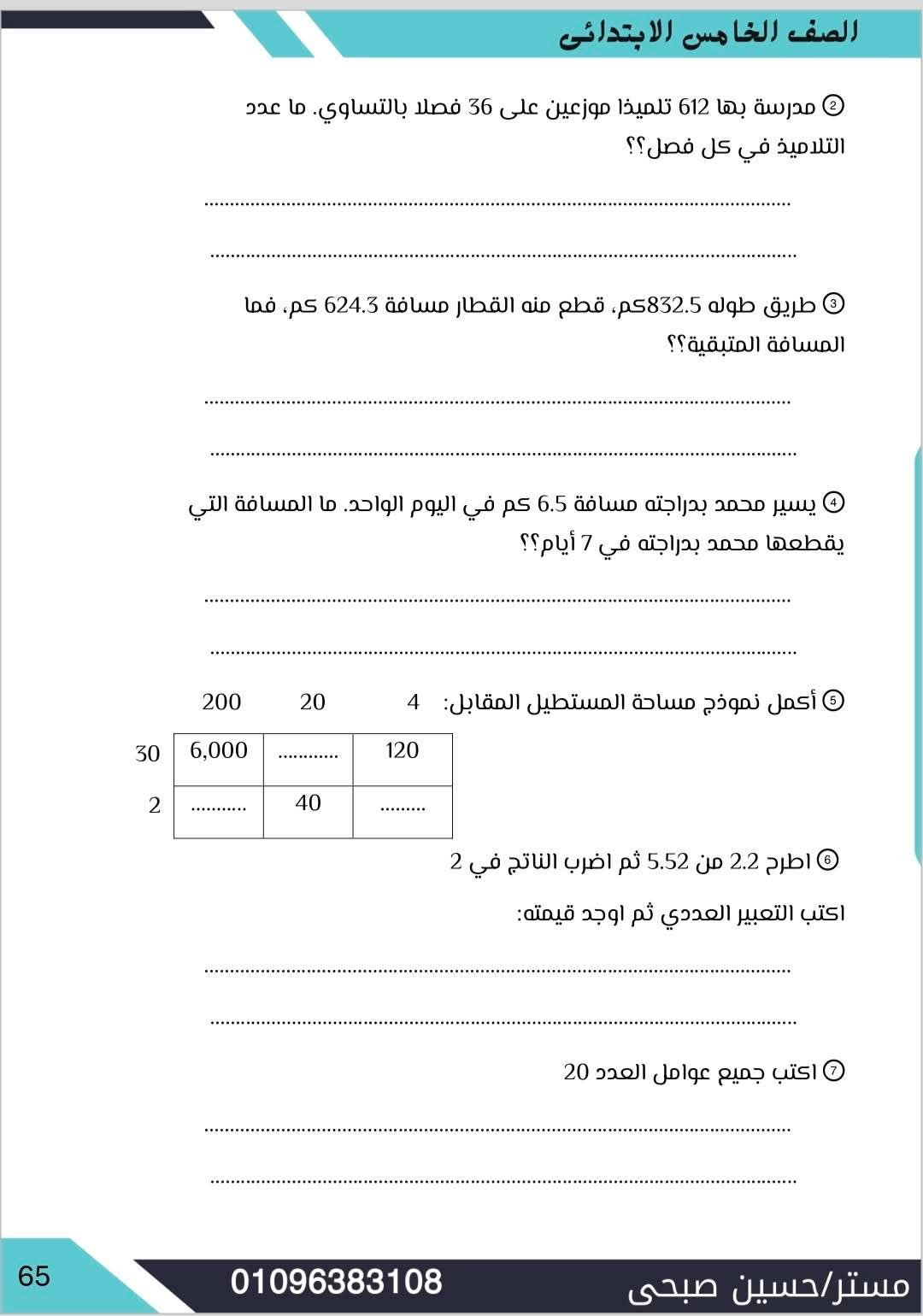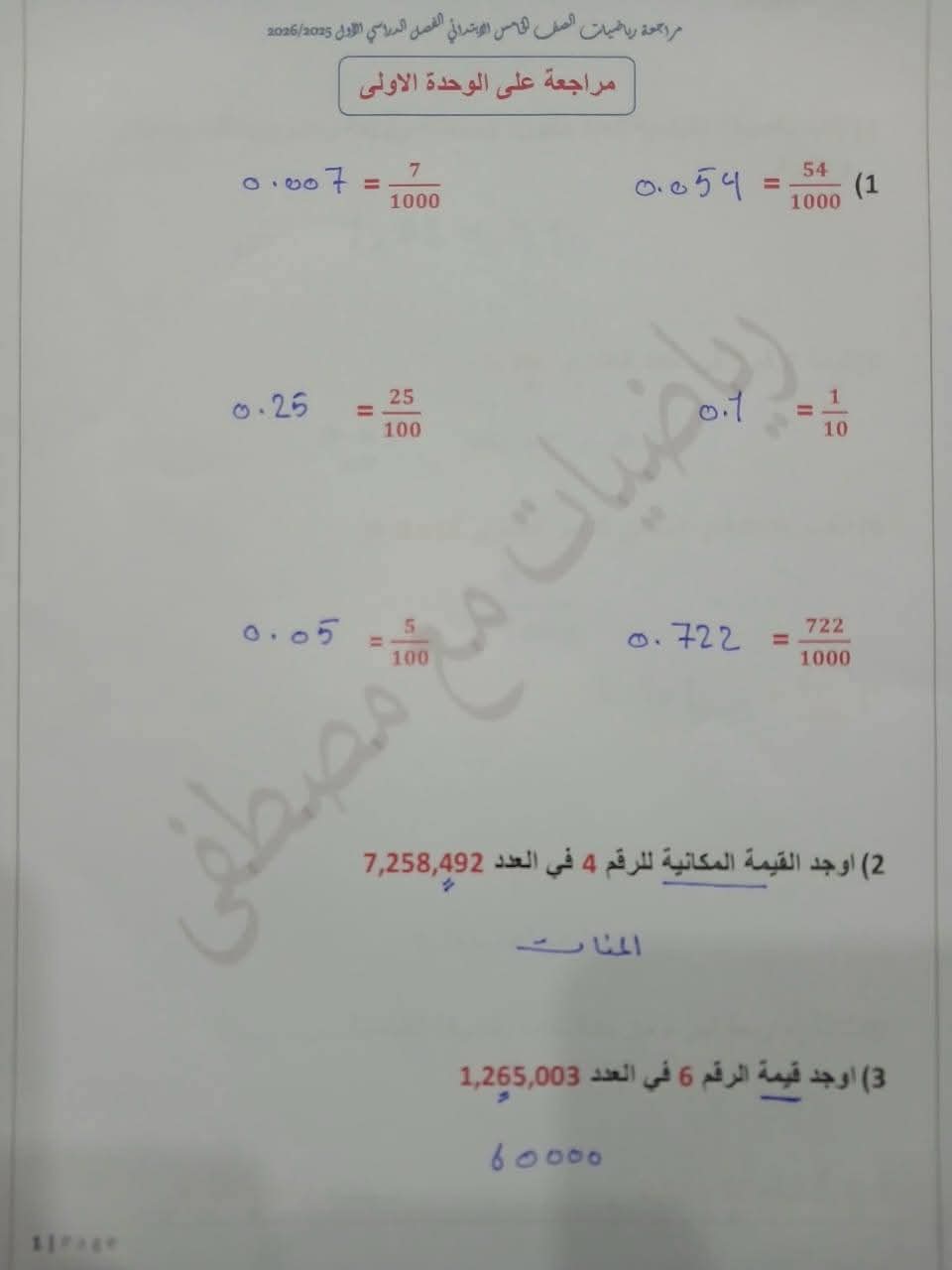 مراجعة مادة الرياضيات الصف الخامس الابتدائي