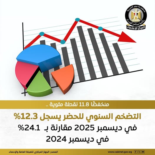 وبالمقارنة مع ديسمبر 2024، سجل معدل التضخم انخفاضًا ملحوظًا قدره 11.8 نقطة مئوية، ما يعكس تأثير السياسات الاقتصادية التي نفذتها الحكومة منذ مارس 2024 للحد من التضخم وتعزيز استقرار الأسواق.