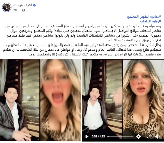 وقال فرحات، عبر صفحته الشخصية على موقع "فيسبوك": "رغم الجهود الكبيرة التي تبذلها وحدات الرصد لمتابعة من يطلقون على أنفسهم صانعي محتوى، ورغم الأخبار المتداولة عن ضبط عناصر استغلت مواقع التواصل الاجتماعي أسوأ استغلال، متعدية على قيم ومبادئ المجتمع، ومحققة أرباحًا من مصادر مجهولة".