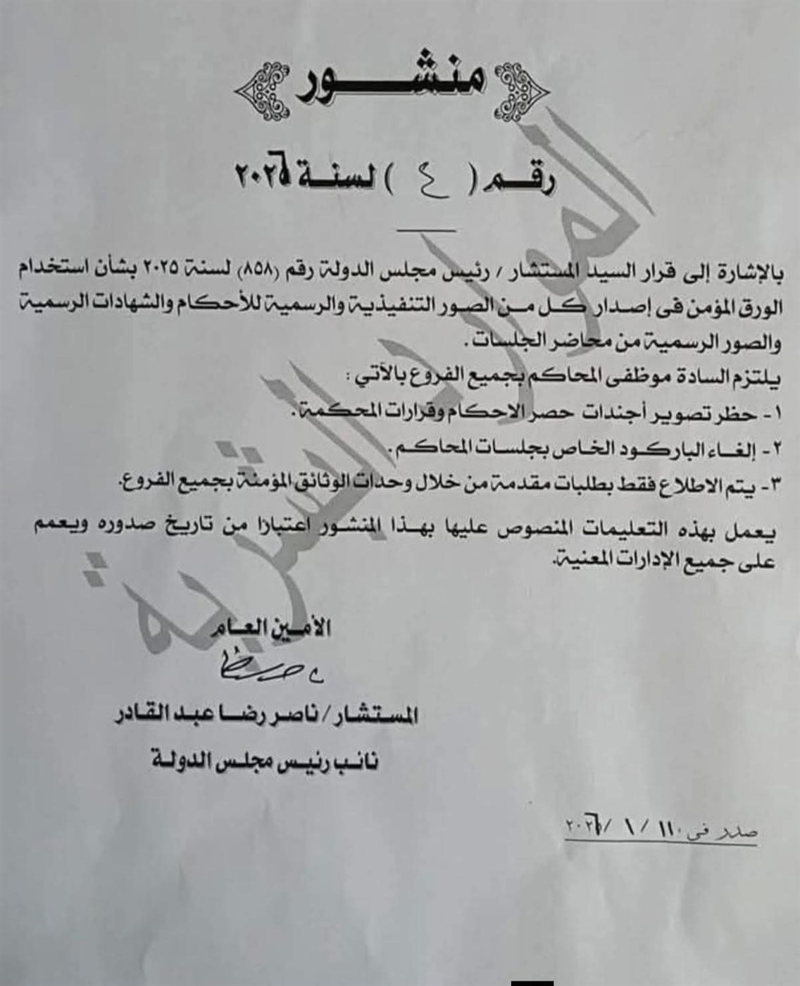أصدر مجلس الدولة منشورًا حمل رقم 4 لسنة 2026، بشأن تنظيم إجراءات الاطلاع واستخدام الورق المؤمن في إصدار الصور التنفيذية والرسمية للأحكام والشهادات الرسمية، وكذلك الصور الرسمية من محاضر الجلسات.