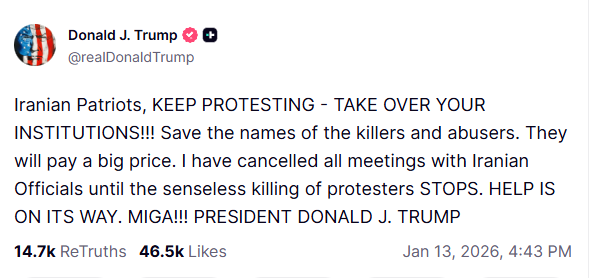 وفي منشور عبر منصته "تروث سوشال"، خاطب ترامب المتظاهرين الإيرانيين قائلًا: "أيها الوطنيون الإيرانيون، استمروا في الاحتجاج، سيطروا على مؤسساتكم! احفظوا أسماء القتلة والمعتدين، سيدفعون ثمنًا باهظًا".