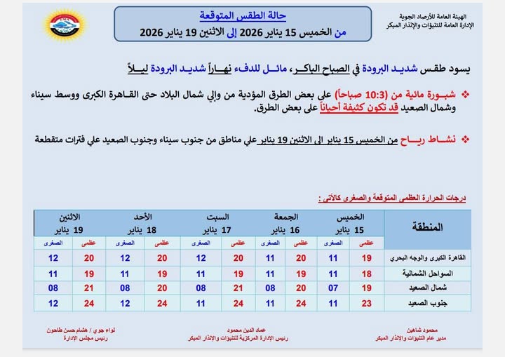 - نشاط متقطع للرياح في بعض المناطق، خاصة في جنوب سيناء وجنوب الصعيد، ما قد يزيد من شعور البرودة.