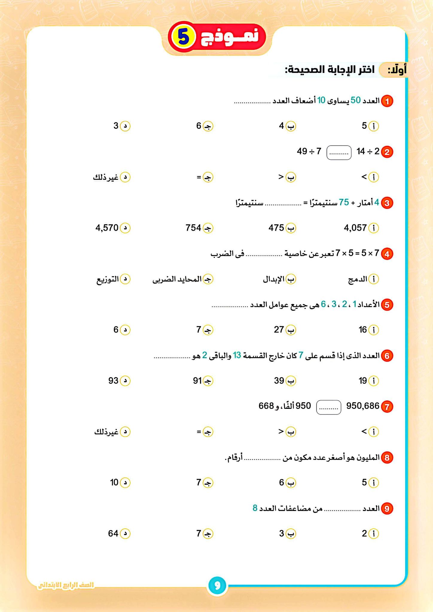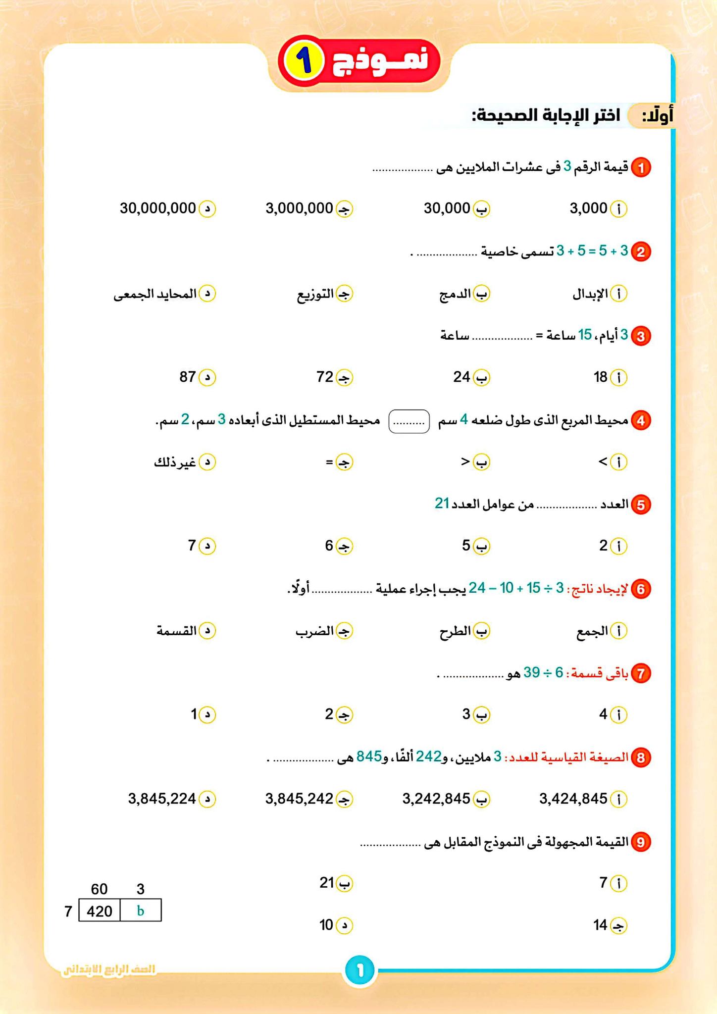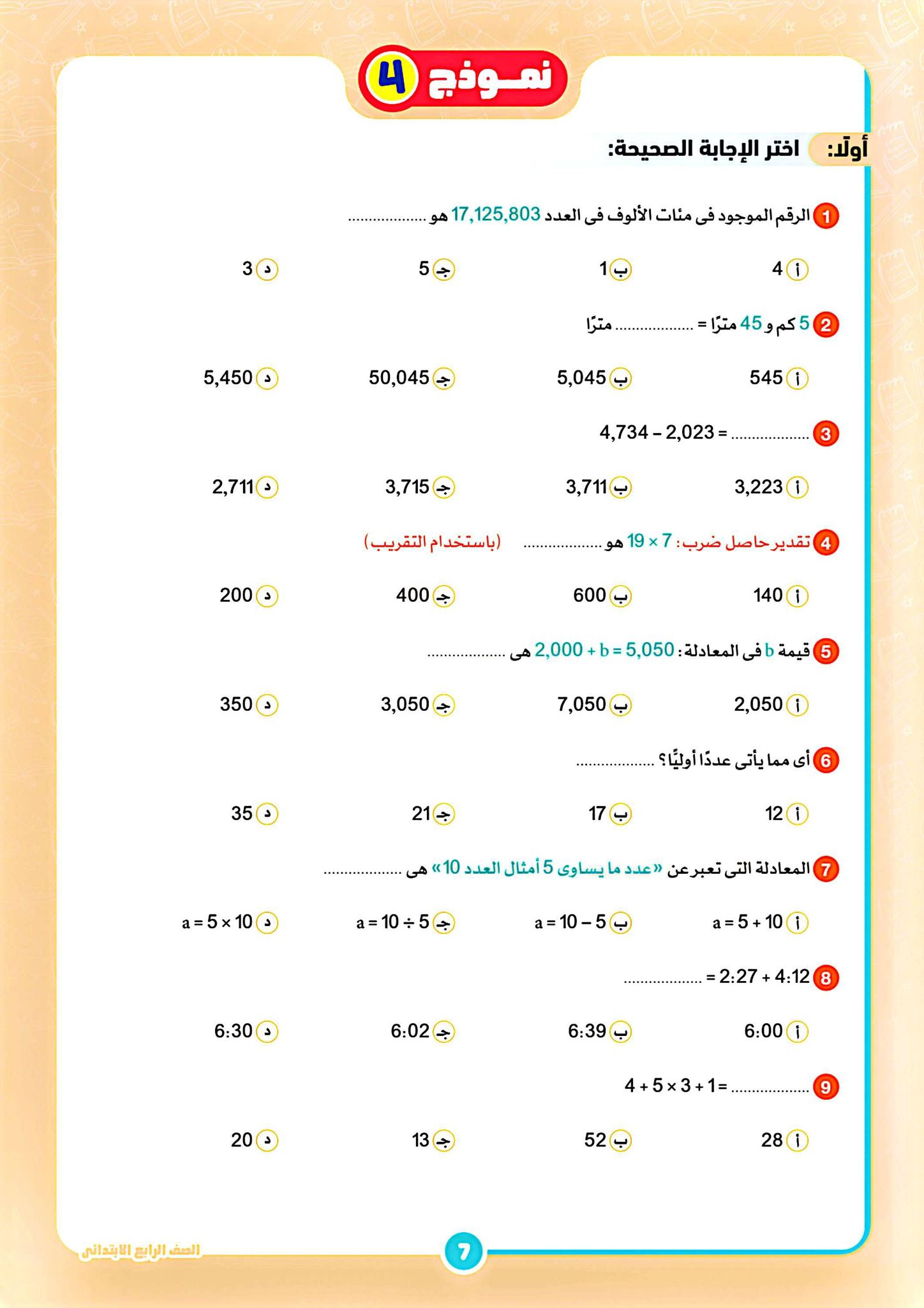 ويمكن للطالب مراجعة مادة الرياضيات من خلال الاطلاع على نماذج امتحانات الرياضيات للصف الرابع الابتدائي الترم الأول 2026 كالتالي: