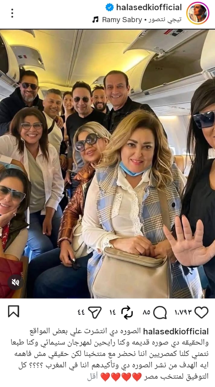 وعلقت هالة صدقي عبر حسابها الشخصي على "إنستجرام" على نشر الصورة قائلة: "الصورة دي انتشرت على بعض المواقع، والحقيقة أنها صورة قديمة وكنا رايحين لمهرجان سينمائي، وكنا طبعًا نتمنى جميعًا كمصريين أن نحضر مع منتخبنا، لكن حقيقي مش فاهمة إيه الهدف من نشر الصورة دي، وتأكيدهم أننا في المغرب".