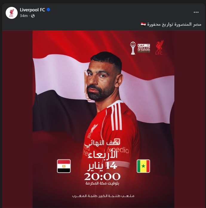 ونشر نادي ليفربول عبر حسابه الرسمي على موقع “فيسبوك” صورة لمحمد صلاح، ظهر خلالها وخلفه علم مصر، وعلّق عليها قائلًا: “مصر المنصورة تواريخ محفورة”، في رسالة تعكس الدعم المعنوي للنجم المصري قبل اللقاء الحاسم، وتؤكد المكانة الكبيرة التي يحظى بها داخل أسوار ملعب “أنفيلد”.