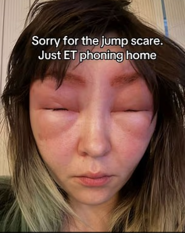 في غضون ساعات، تورم وجهها بشدة حتى عيناها أُغلقا تمامًا، ولم تعد ترى إلا من خلال شقوق صغيرة، وفقدت مجال رؤيتها المحيطي، مع ذلك، قالت إنها لم تشعر بألم.