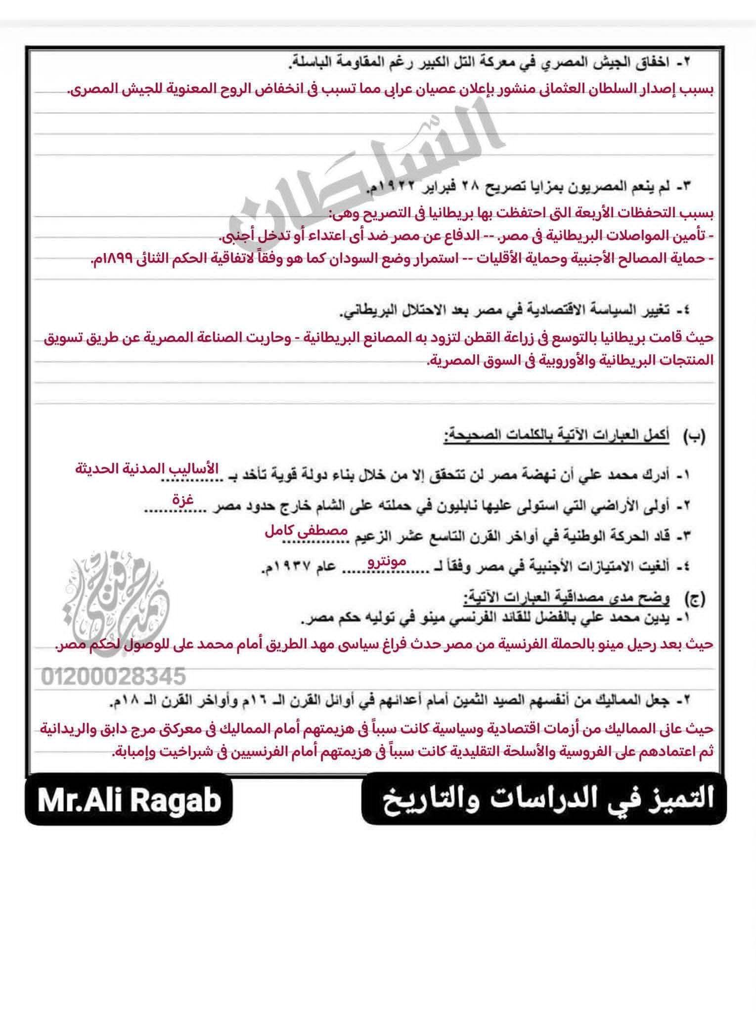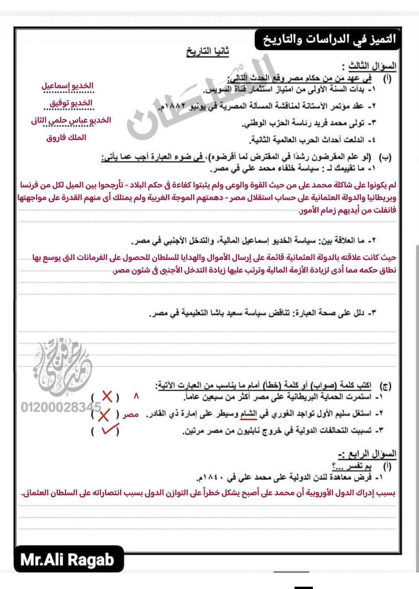 نماذج امتحانات دراسات الصف الثالث الإعدادي وإجاباتها