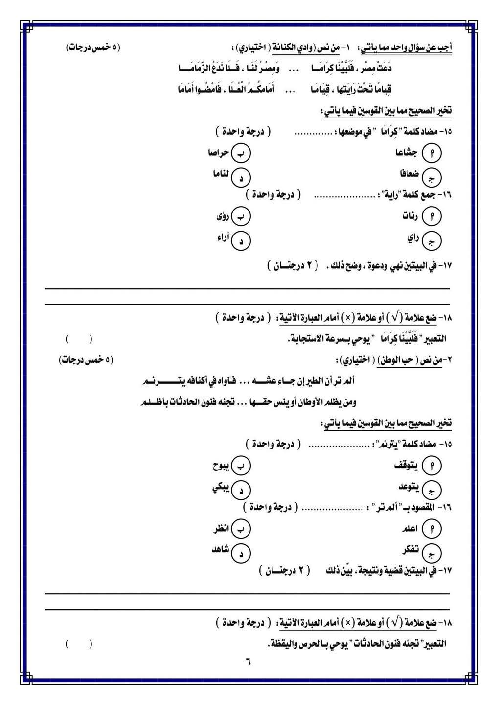 حل امتحانات عربي للصف الثالث الإعدادي الترم الأول 2026 النموذجي