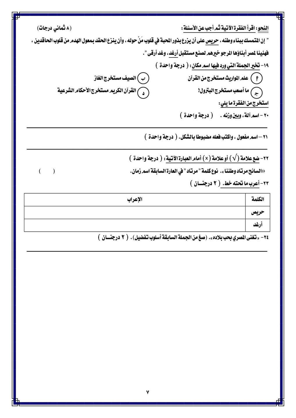 حل قطع نحو للصف الثالث الإعدادي الترم الأول، استعدادا لامتحان اللغة العربية