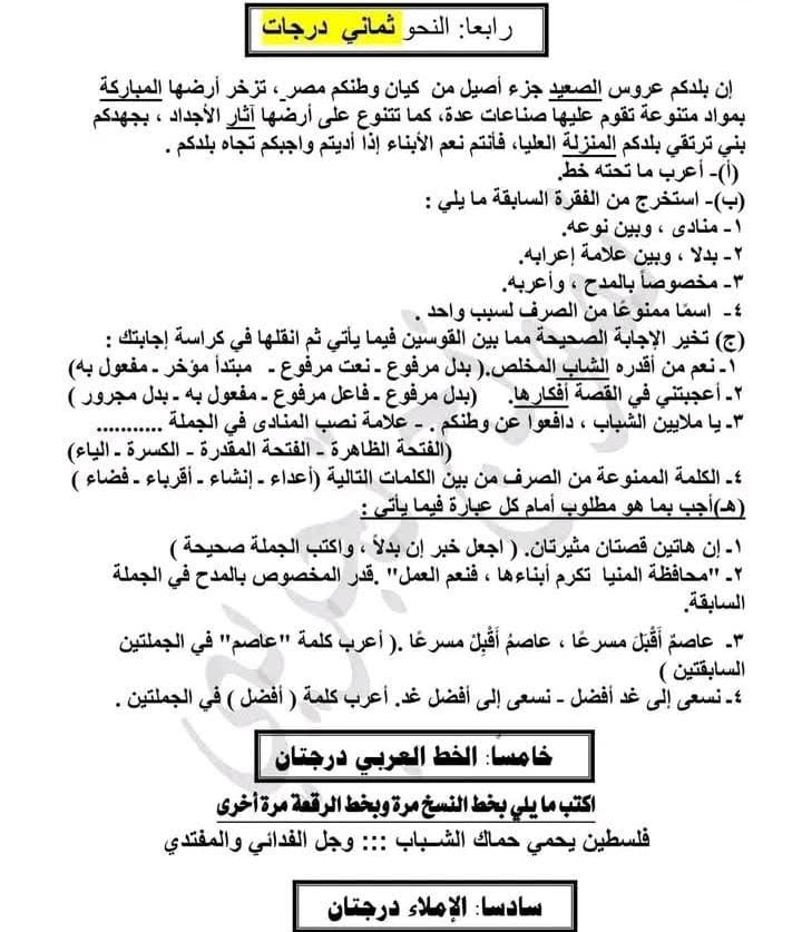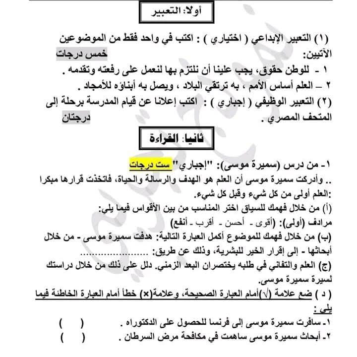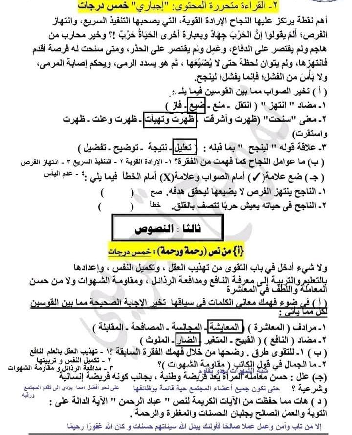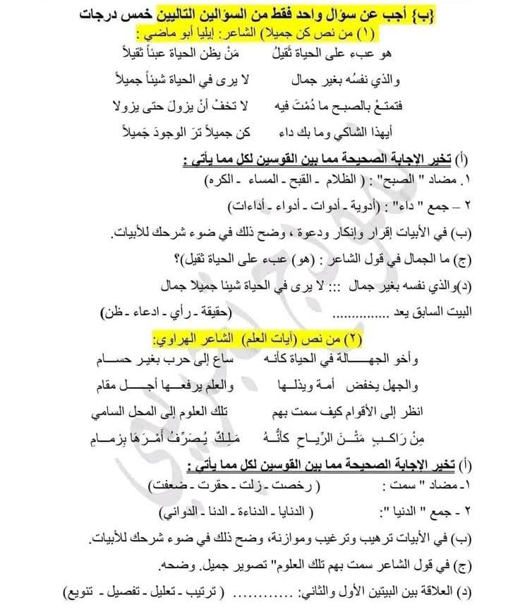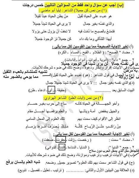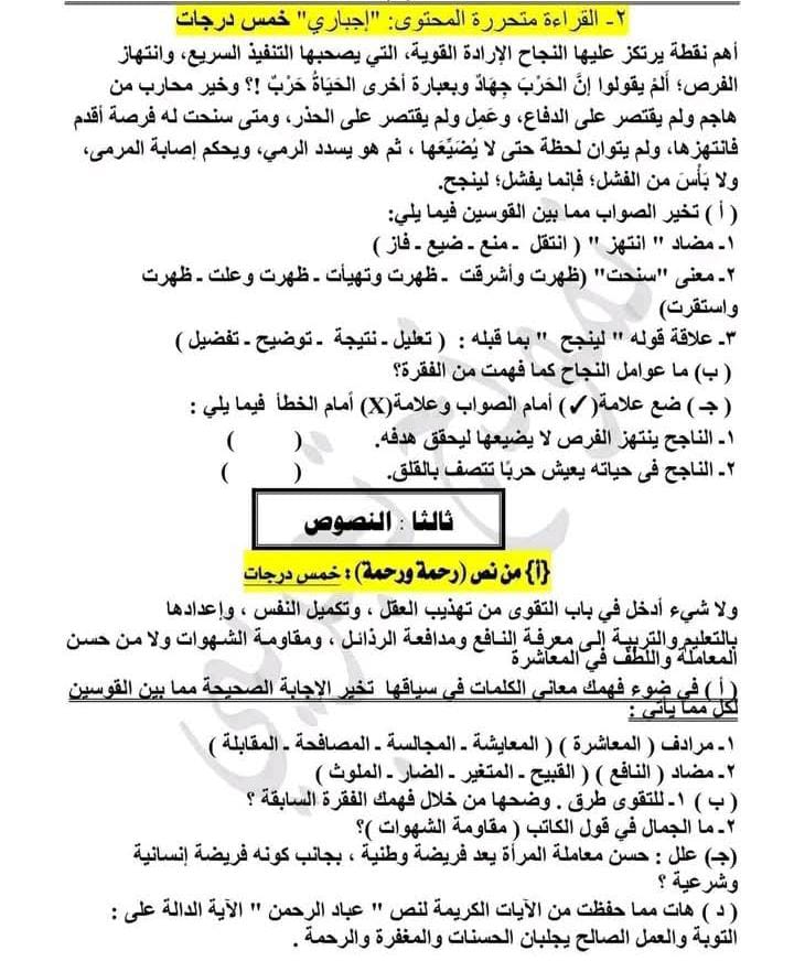حل امتحانات عربي للصف الثالث الإعدادي الترم الأول 2026 النموذجي