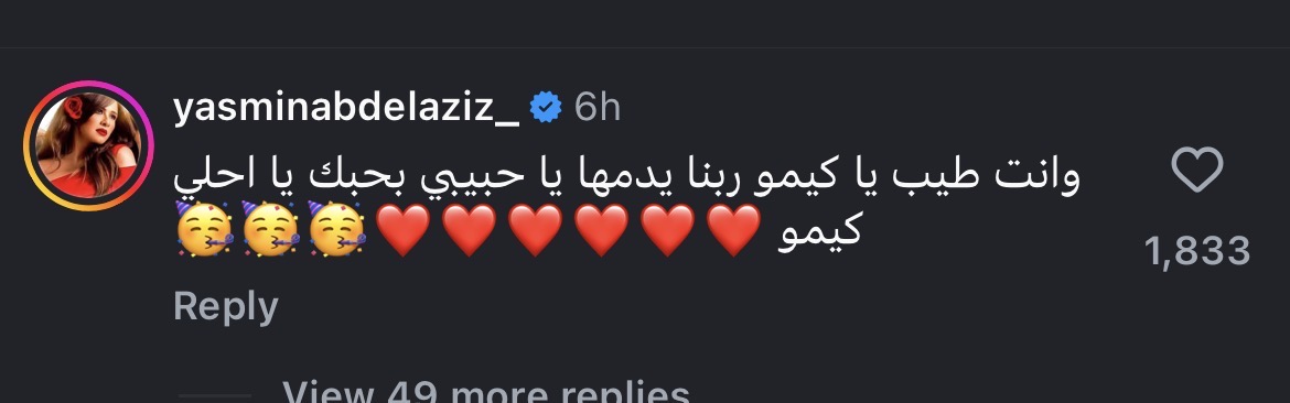 وردّت ياسمين عبد العزيز على رسالة كريم قائلة: "وأنت طيب يا كيمو، ربنا يديمها يا حبيبي، بحبك يا أحلى كيمو".